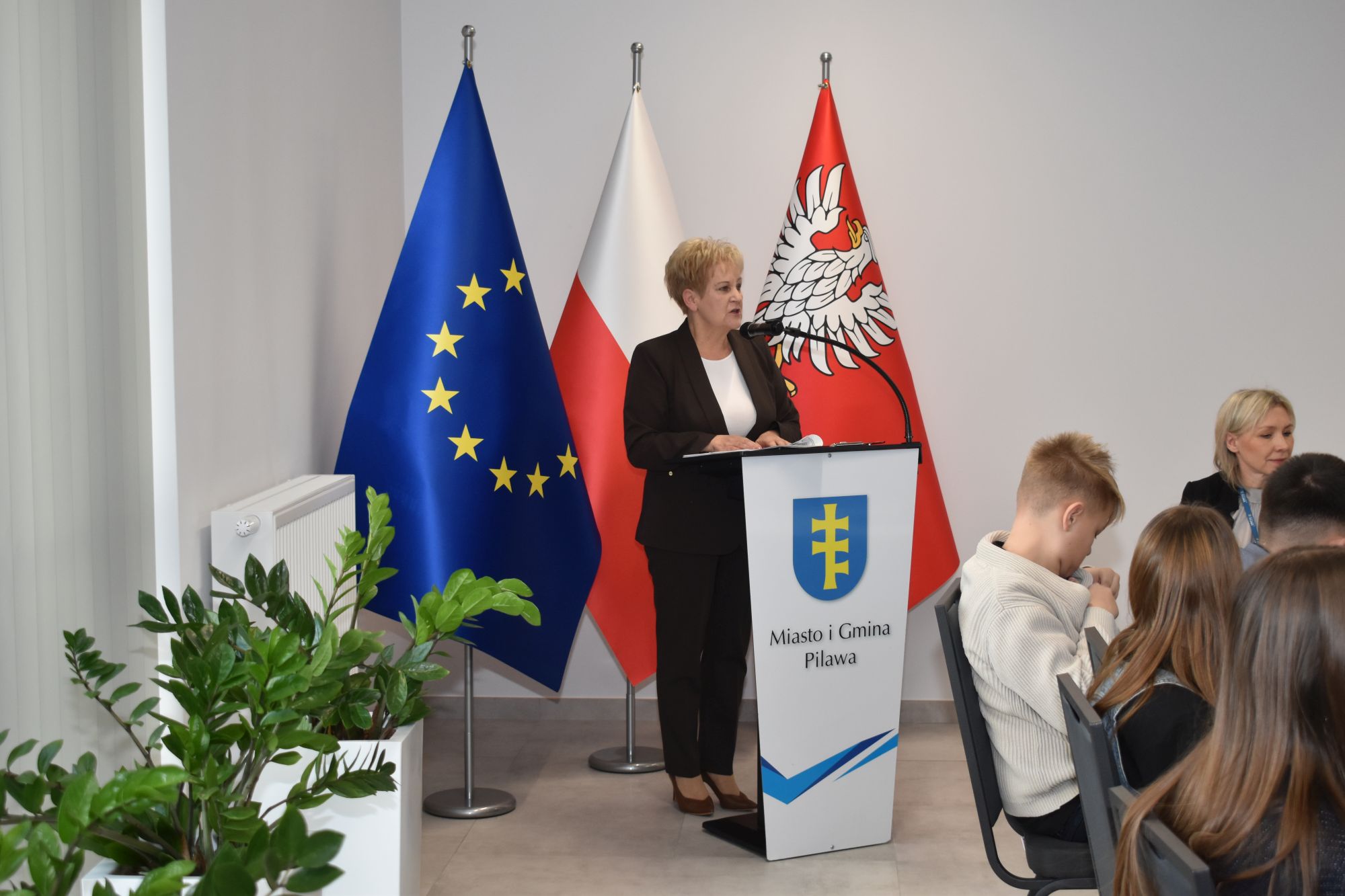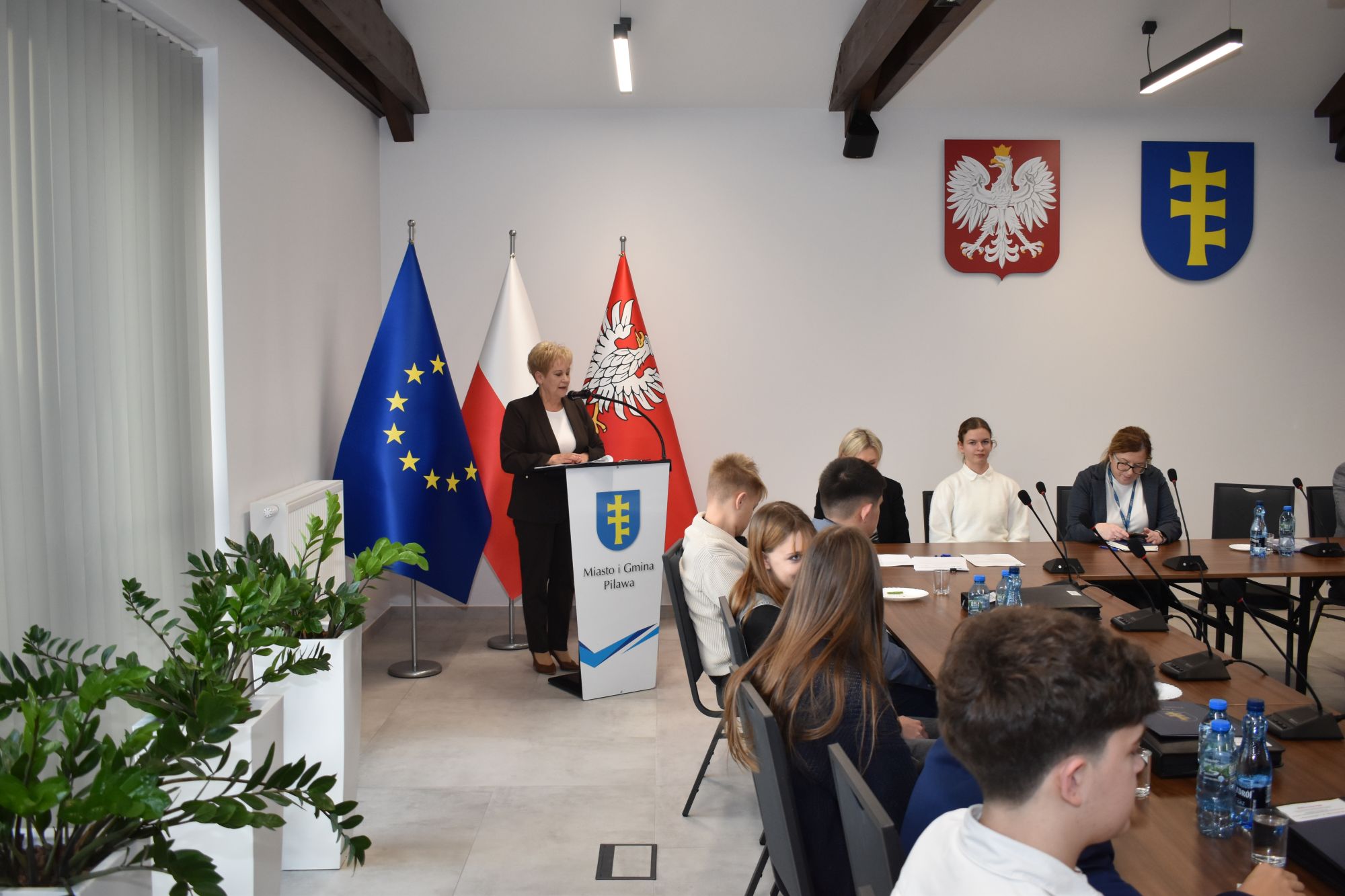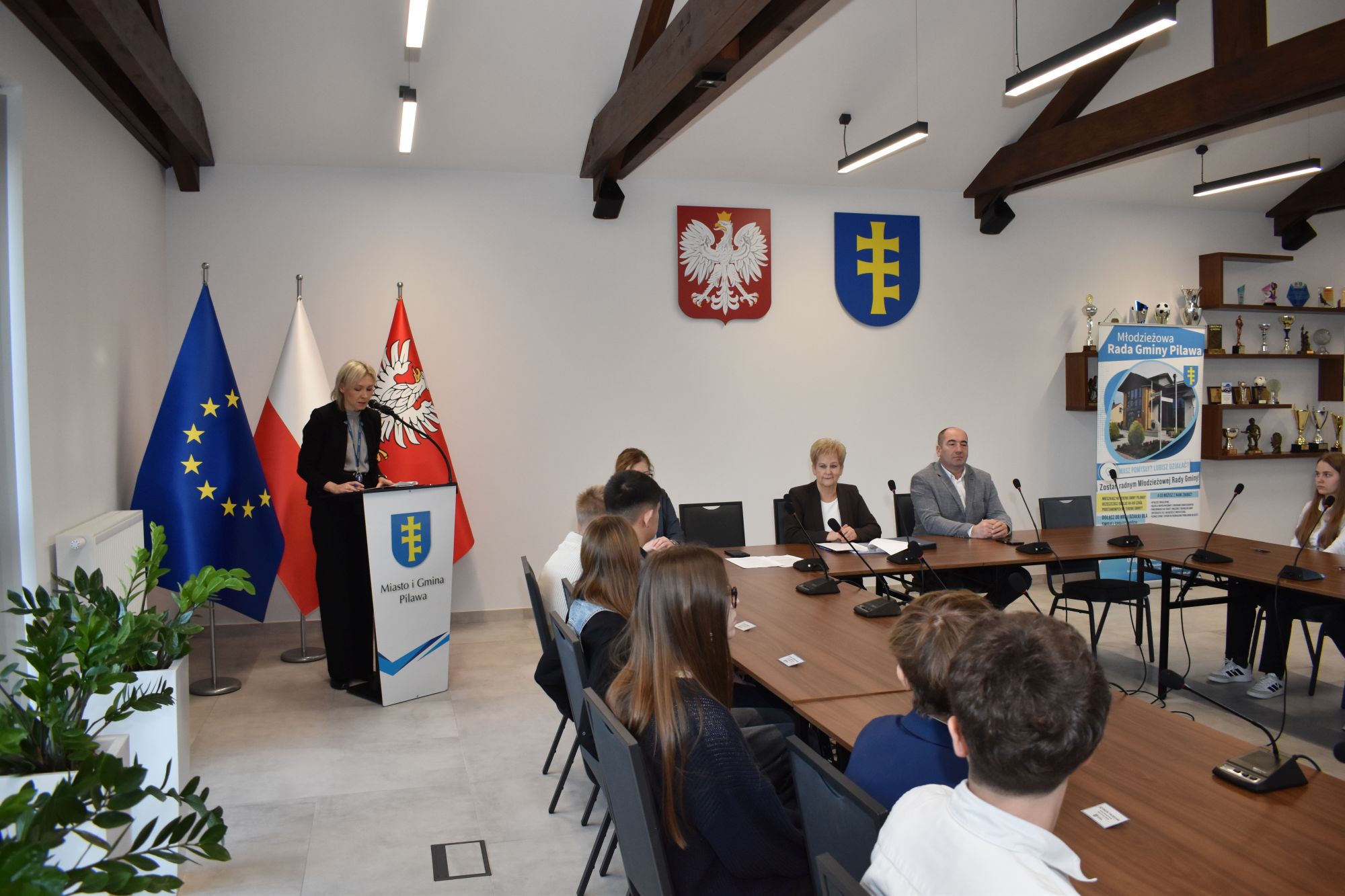 Pierwszą - inauguracyjną sesję otworzyła Burmistrz Miasta i Gminy Pilawa Albina Łubian, która na wstępie pogratulowała młodym radnym wyboru oraz podkreśliła, jak ważnym elementem życia publicznego jest włączanie młodzieży w procesy decyzyjne i dialog obywatelski. W swoim wystąpieniu zaznaczyła, że powołanie Młodzieżowej Rady, to inwestycja w przyszłość – w aktywność obywatelską, odpowiedzialność i wrażliwość młodych ludzi. Zwróciła uwagę, że energia młodego pokolenia, świeże spojrzenie i odwaga w formułowaniu pomysłów mogą realnie wpłynąć na rozwój lokalnej społeczności.