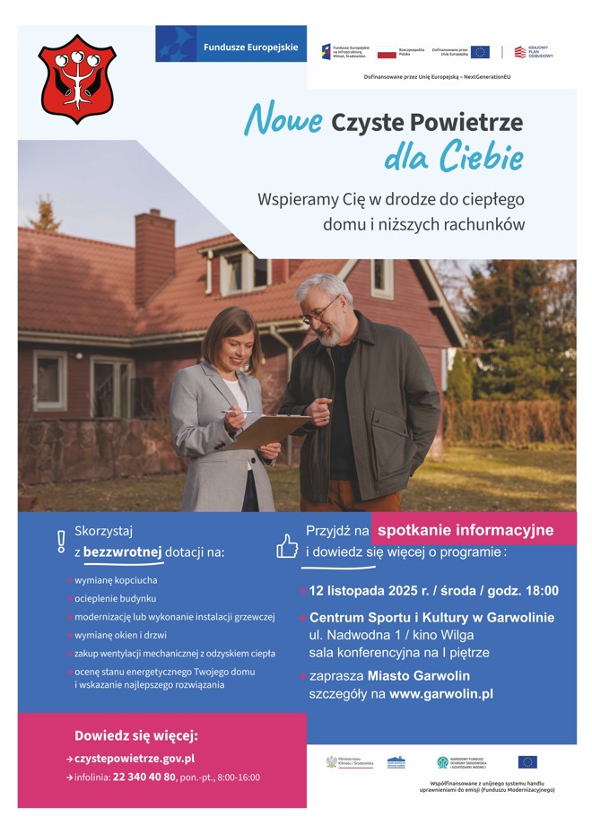 Miasto Garwolin zaprasza na spotkanie informacyjne – 12 listopada 2025 roku. Będzie na nim ekspert z Wojewódzkiego Funduszu Ochrony Środowiska i Gospodarki Wodnej w Warszawie, który opowie też o programach Moje Ciepło i Moja Elektrownia Wiatrowa.