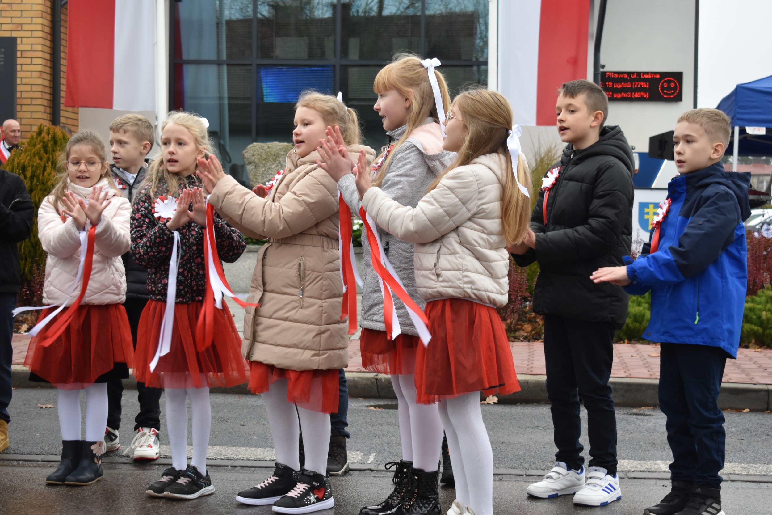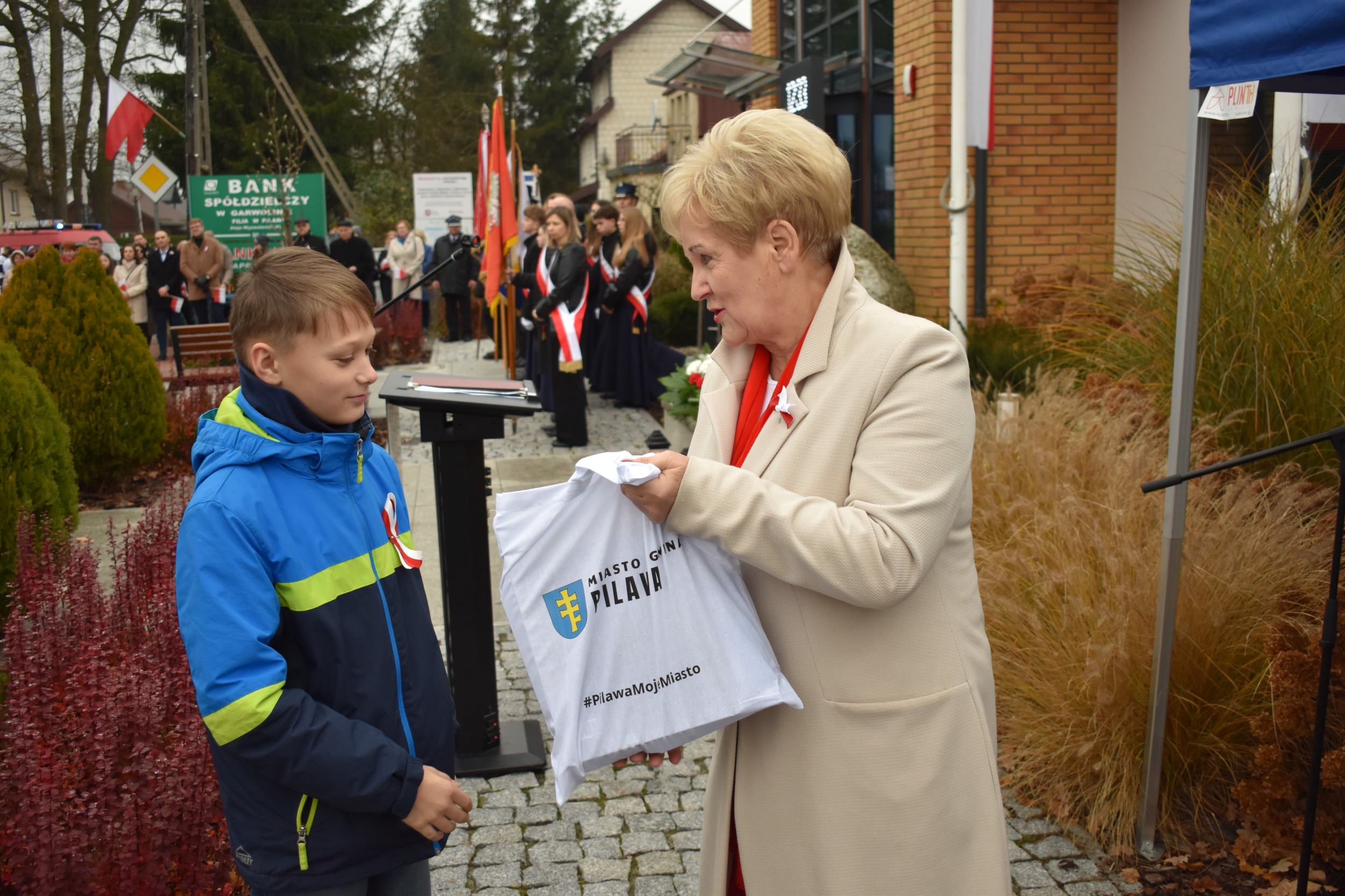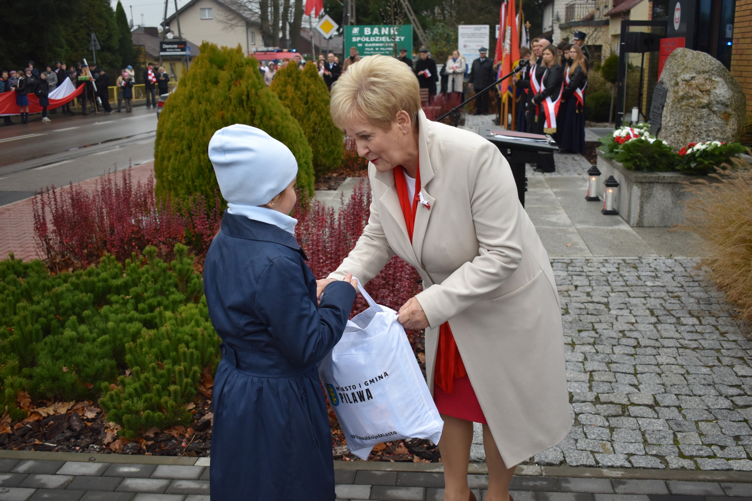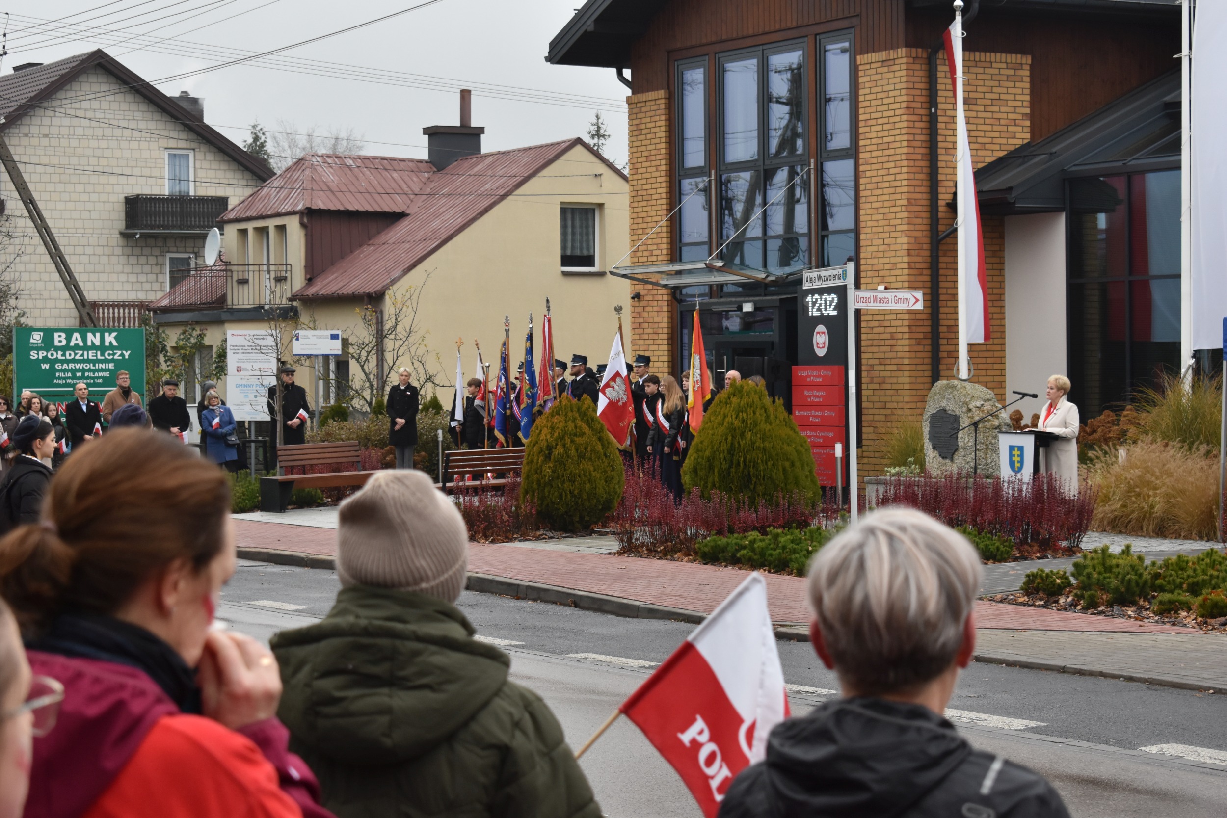 Po zakończonym nabożeństwie uczestnicy, prowadzeni przez orkiestrę, udali się pod pomnik upamiętniający bohaterów walk o wolność i niepodległość Ojczyzny zlokalizowany przed budynkiem Urzędu Miasta i Gminy Pilawa, gdzie odbyła się dalsza część obchodów. Tutaj wspólnie odśpiewano hymn państwowy w ramach akcji „Do hymnu!”, a następnie Burmistrz Miasta i Gminy Pilawa Albina Łubian wygłosiła swoje okolicznościowe przemówienie. W krótkim wystąpieniu podkreśliła znaczenie wspólnego przeżywania narodowych świąt, pamięci o historii i szacunku dla tych, którzy walczyli o niepodległość. Przypomniała, że wolność nie jest dana raz na zawsze. Wymaga troski, jedności i odpowiedzialności. To nie tylko piękna tradycja, ale też ważny wyraz naszej narodowej dumy i dbałości o przyszłość Polski. Na zakończenie podziękowała zgromadzonym, którzy przyszli, aby razem oddać hołd bohaterom naszej Ojczyzny.