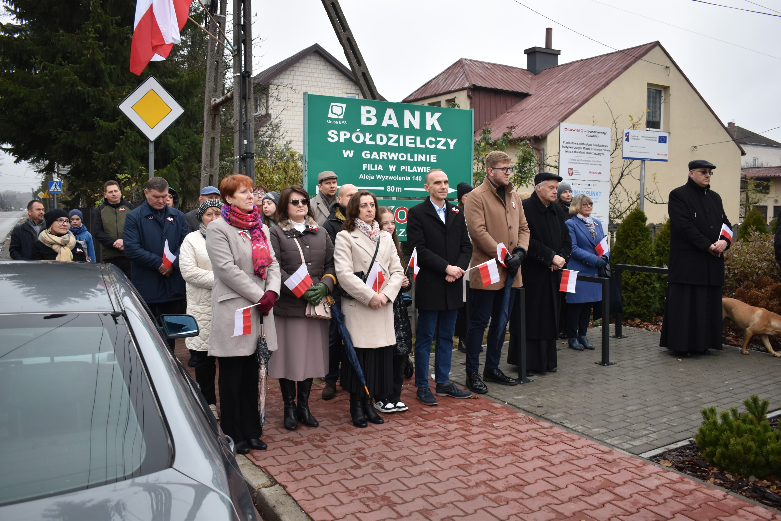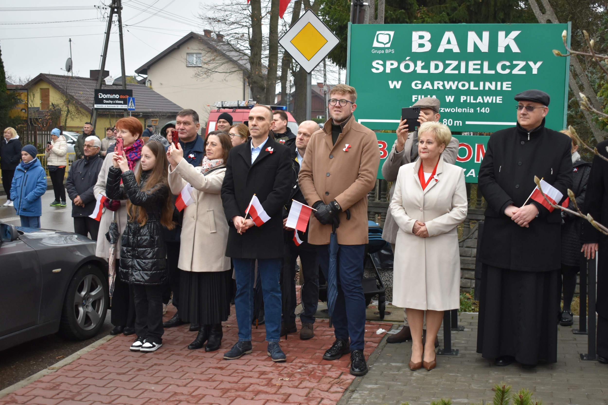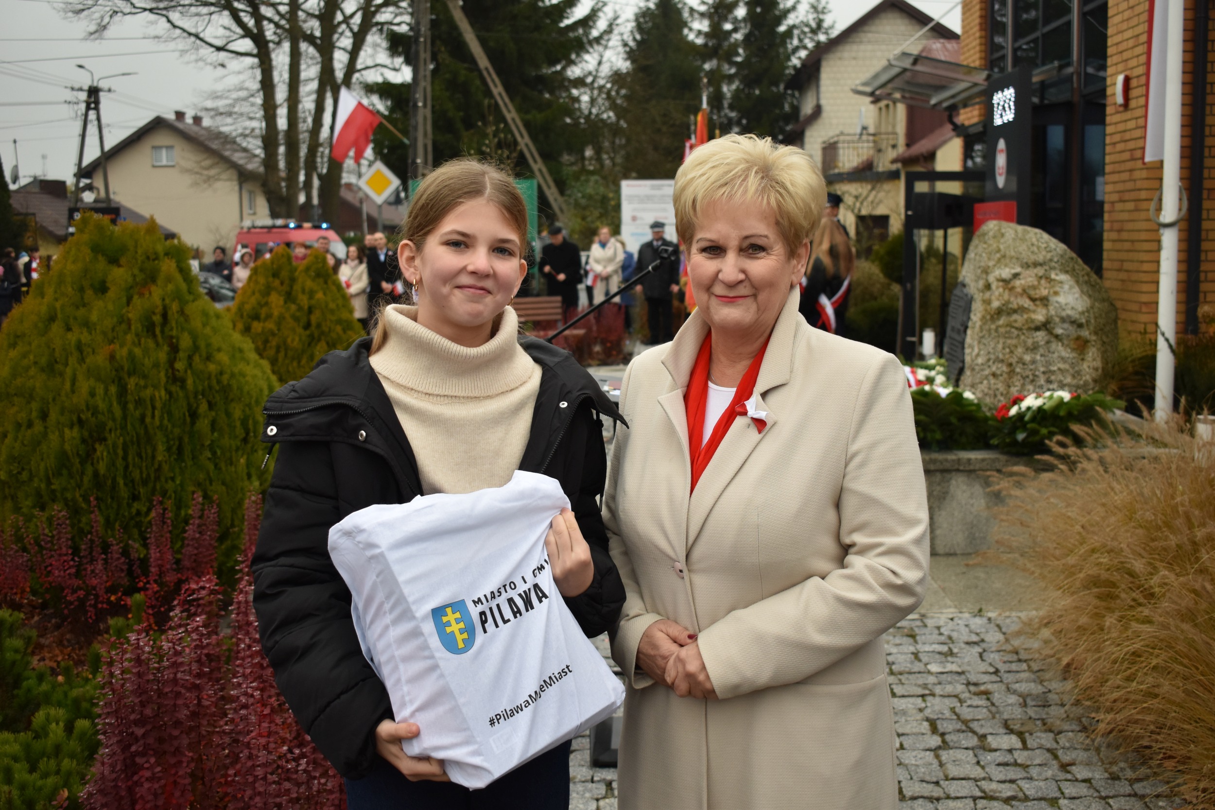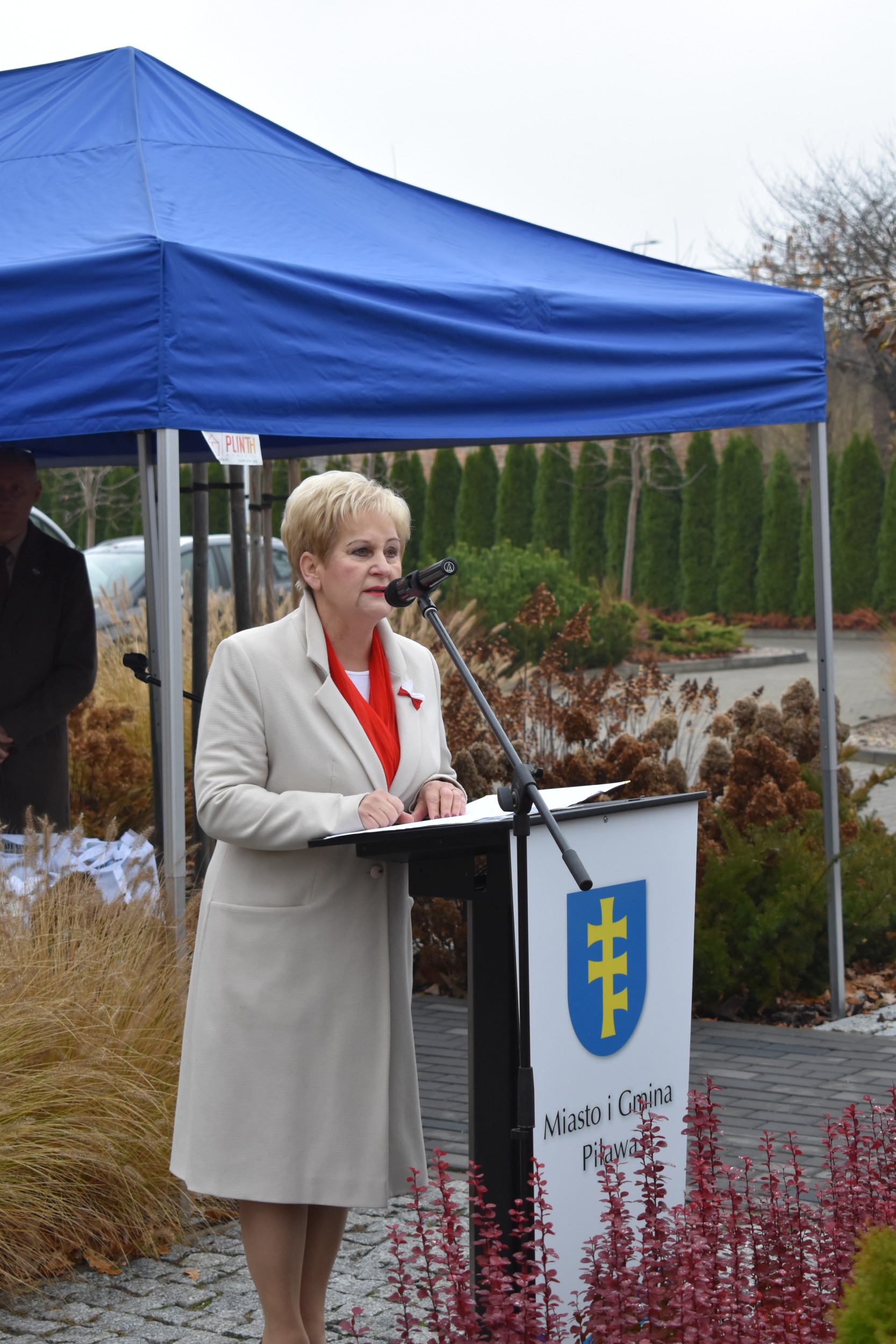 Po zakończonym nabożeństwie uczestnicy, prowadzeni przez orkiestrę, udali się pod pomnik upamiętniający bohaterów walk o wolność i niepodległość Ojczyzny zlokalizowany przed budynkiem Urzędu Miasta i Gminy Pilawa, gdzie odbyła się dalsza część obchodów. Tutaj wspólnie odśpiewano hymn państwowy w ramach akcji „Do hymnu!”, a następnie Burmistrz Miasta i Gminy Pilawa Albina Łubian wygłosiła swoje okolicznościowe przemówienie. W krótkim wystąpieniu podkreśliła znaczenie wspólnego przeżywania narodowych świąt, pamięci o historii i szacunku dla tych, którzy walczyli o niepodległość. Przypomniała, że wolność nie jest dana raz na zawsze. Wymaga troski, jedności i odpowiedzialności. To nie tylko piękna tradycja, ale też ważny wyraz naszej narodowej dumy i dbałości o przyszłość Polski. Na zakończenie podziękowała zgromadzonym, którzy przyszli, aby razem oddać hołd bohaterom naszej Ojczyzny.