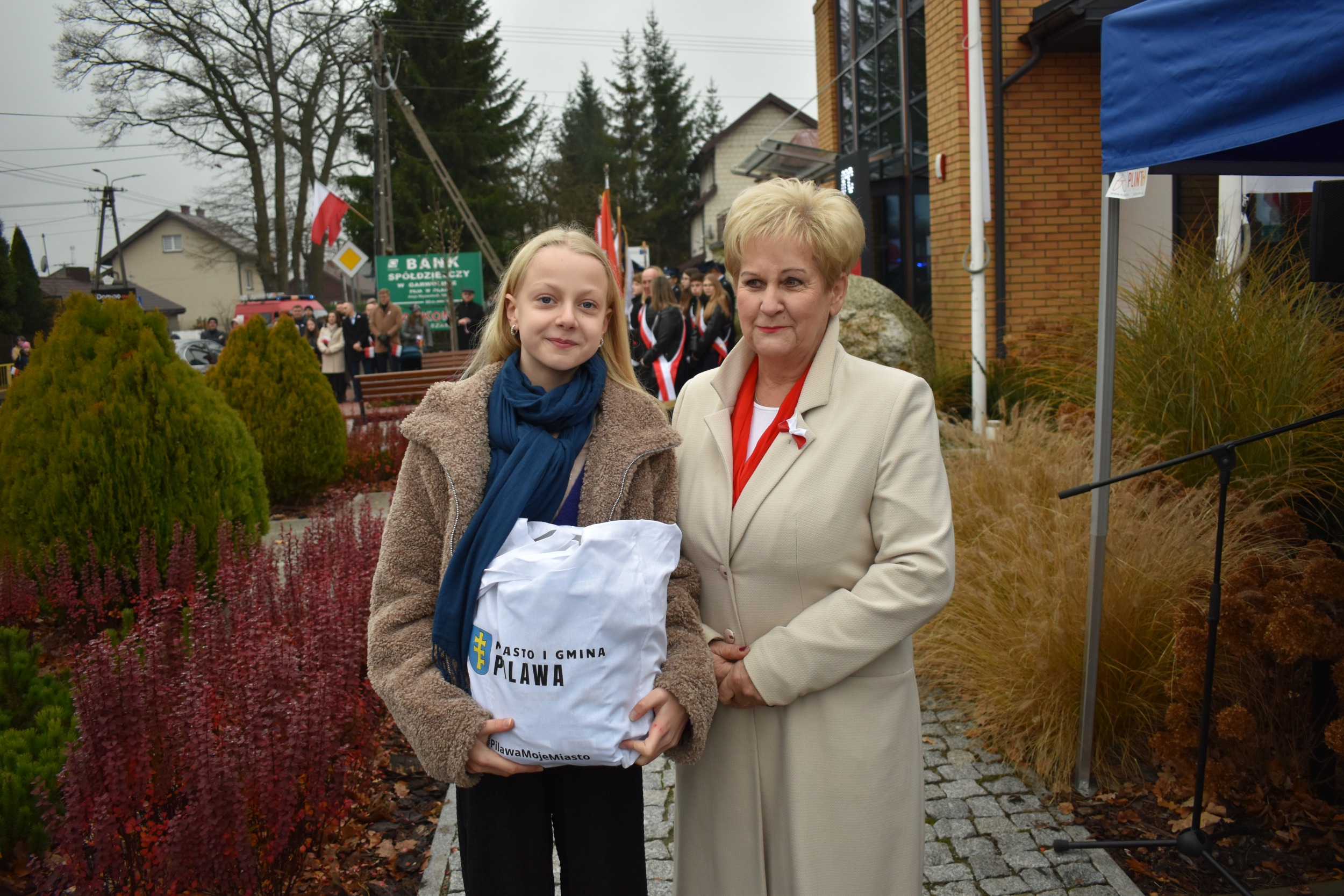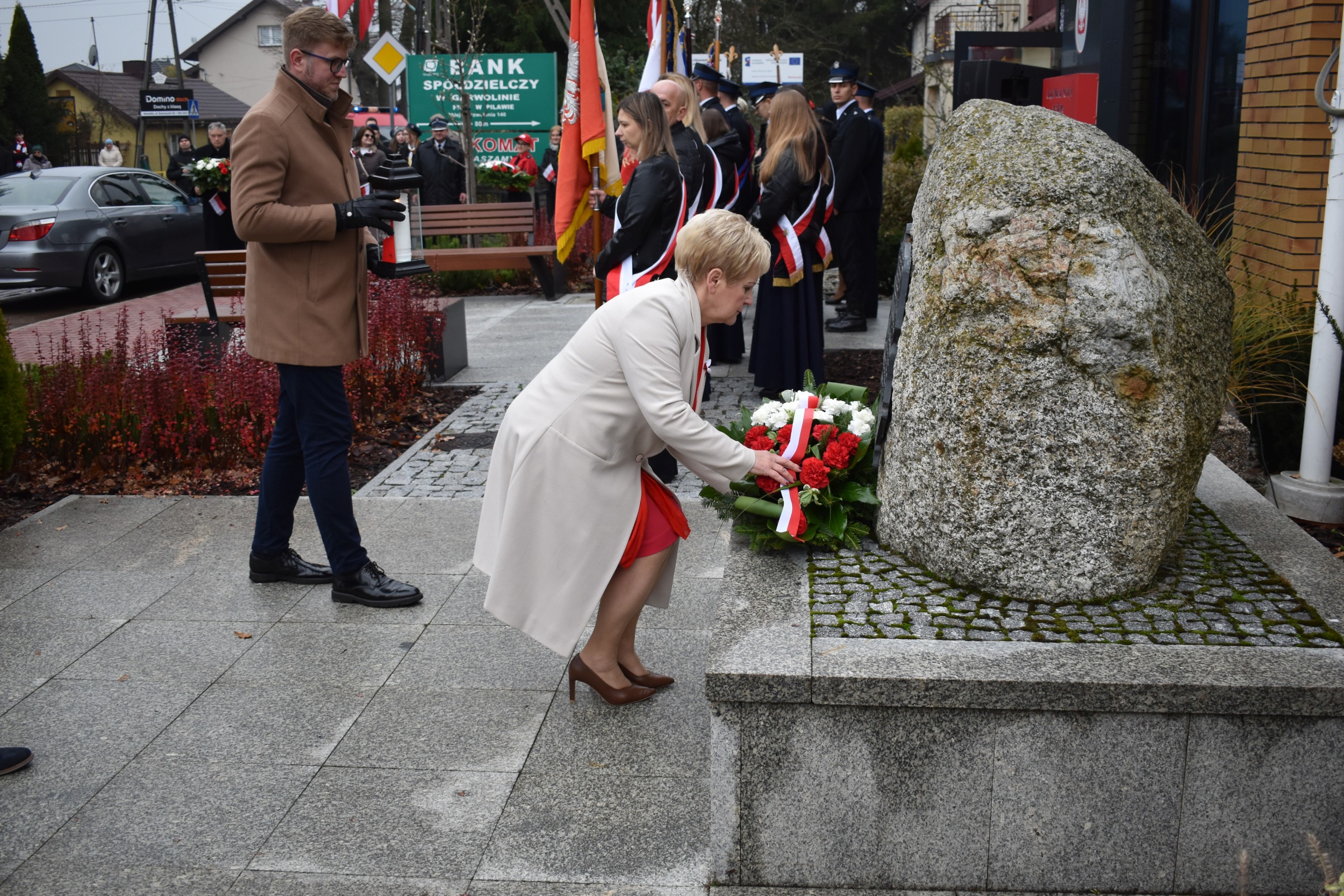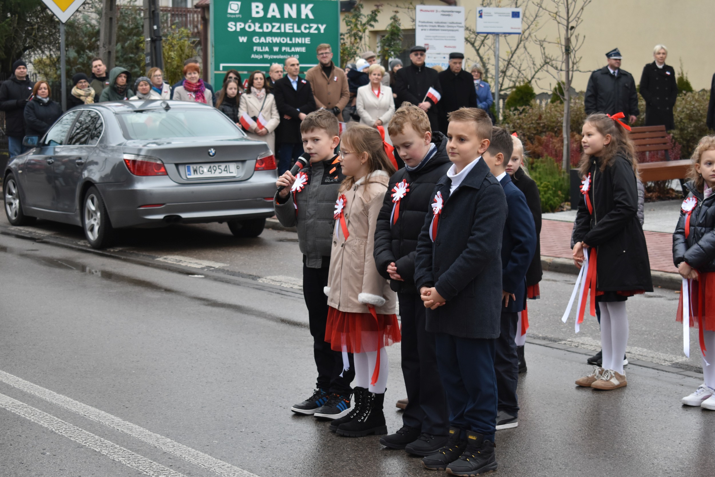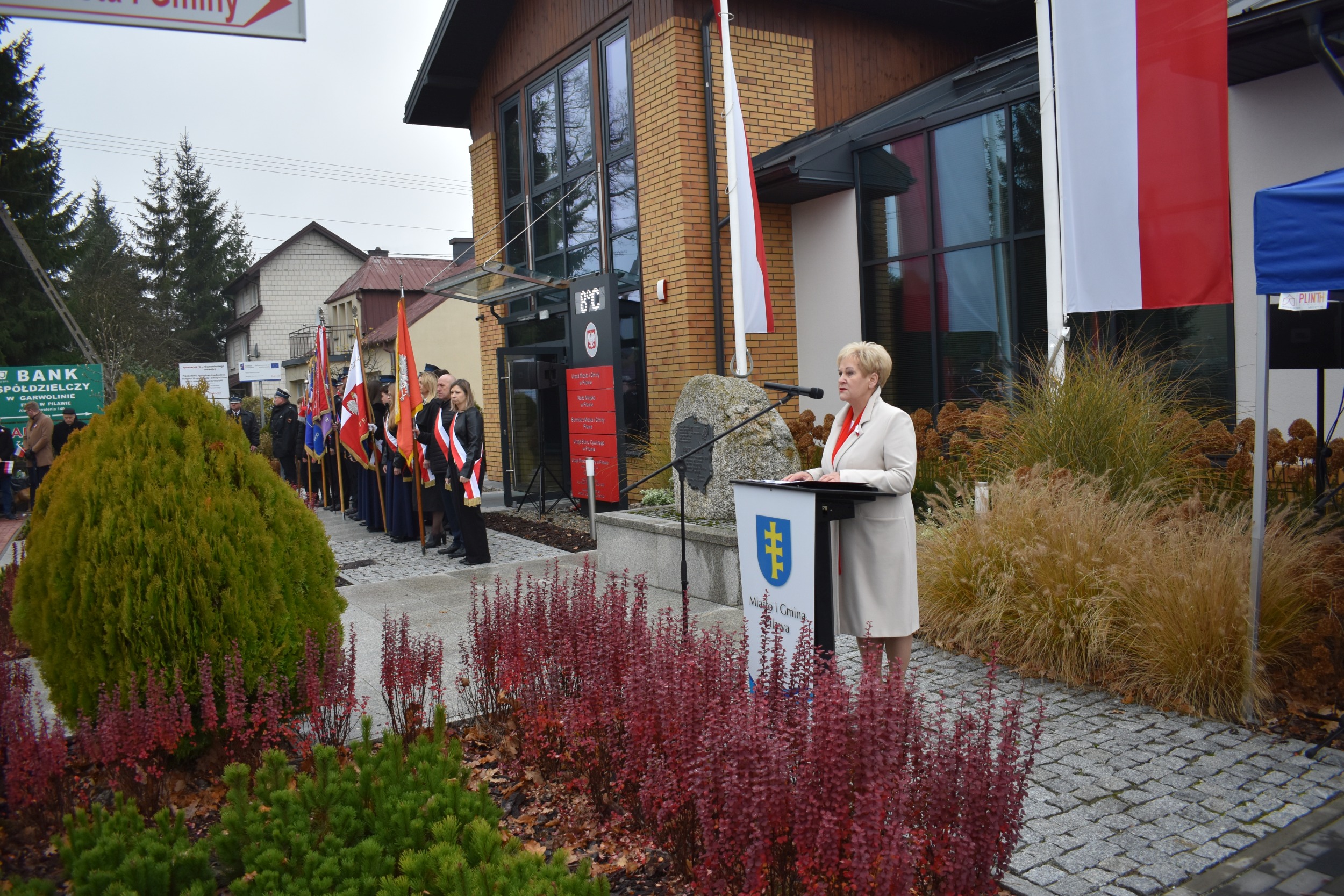 Po zakończonym nabożeństwie uczestnicy, prowadzeni przez orkiestrę, udali się pod pomnik upamiętniający bohaterów walk o wolność i niepodległość Ojczyzny zlokalizowany przed budynkiem Urzędu Miasta i Gminy Pilawa, gdzie odbyła się dalsza część obchodów. Tutaj wspólnie odśpiewano hymn państwowy w ramach akcji „Do hymnu!”, a następnie Burmistrz Miasta i Gminy Pilawa Albina Łubian wygłosiła swoje okolicznościowe przemówienie. W krótkim wystąpieniu podkreśliła znaczenie wspólnego przeżywania narodowych świąt, pamięci o historii i szacunku dla tych, którzy walczyli o niepodległość. Przypomniała, że wolność nie jest dana raz na zawsze. Wymaga troski, jedności i odpowiedzialności. To nie tylko piękna tradycja, ale też ważny wyraz naszej narodowej dumy i dbałości o przyszłość Polski. Na zakończenie podziękowała zgromadzonym, którzy przyszli, aby razem oddać hołd bohaterom naszej Ojczyzny.