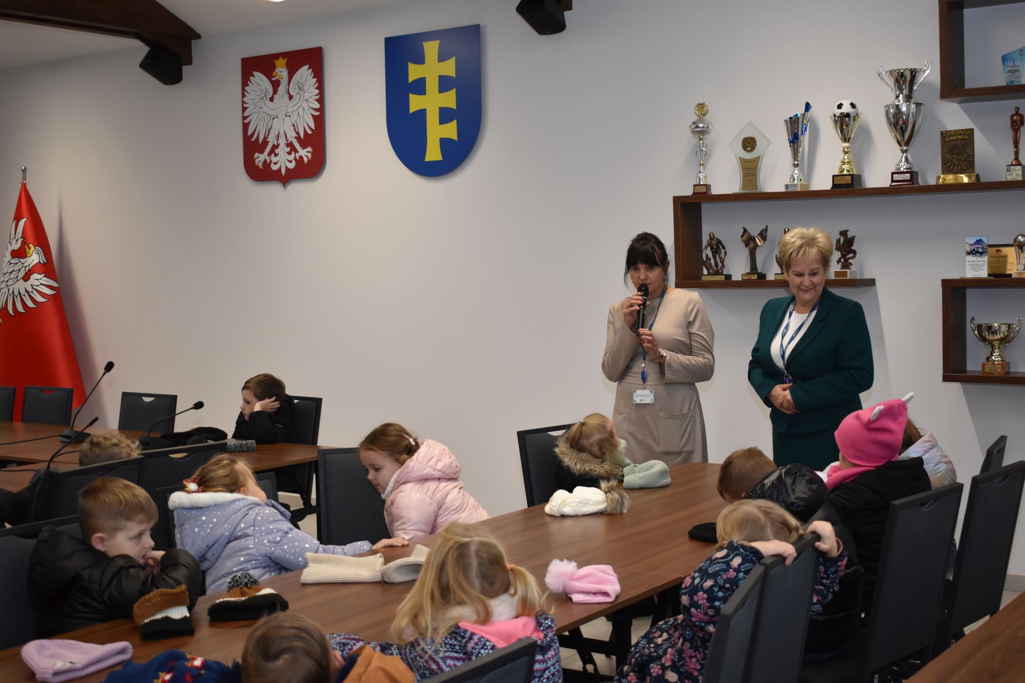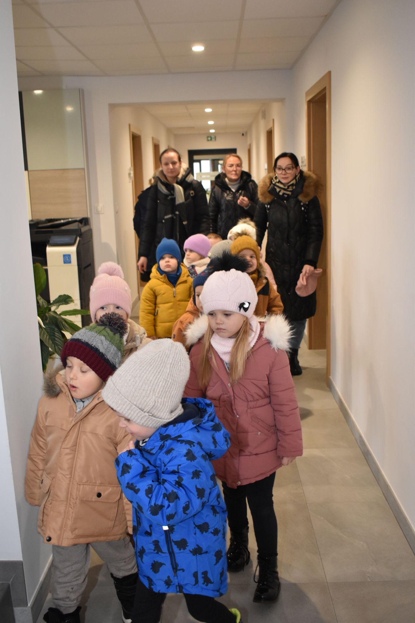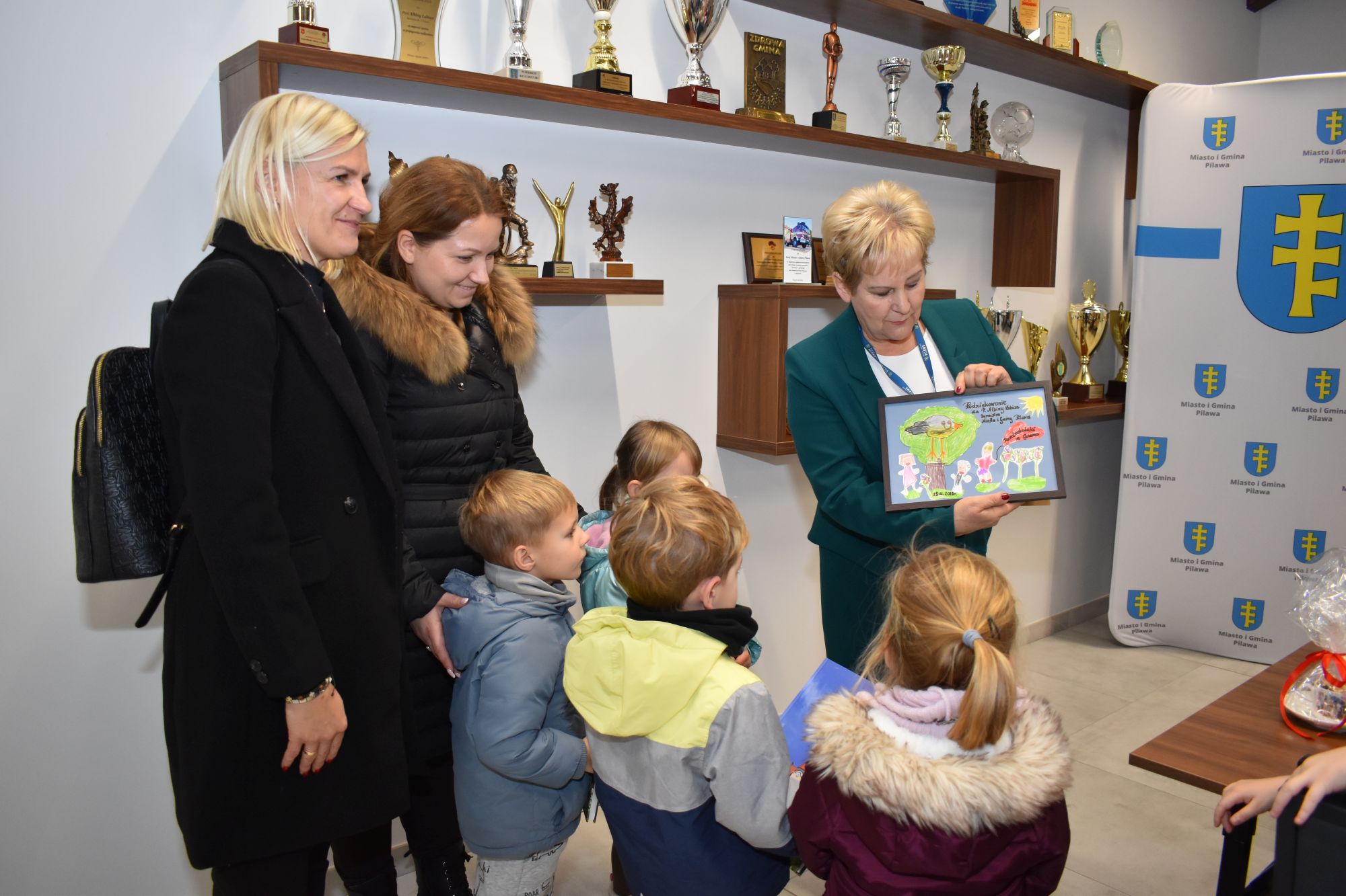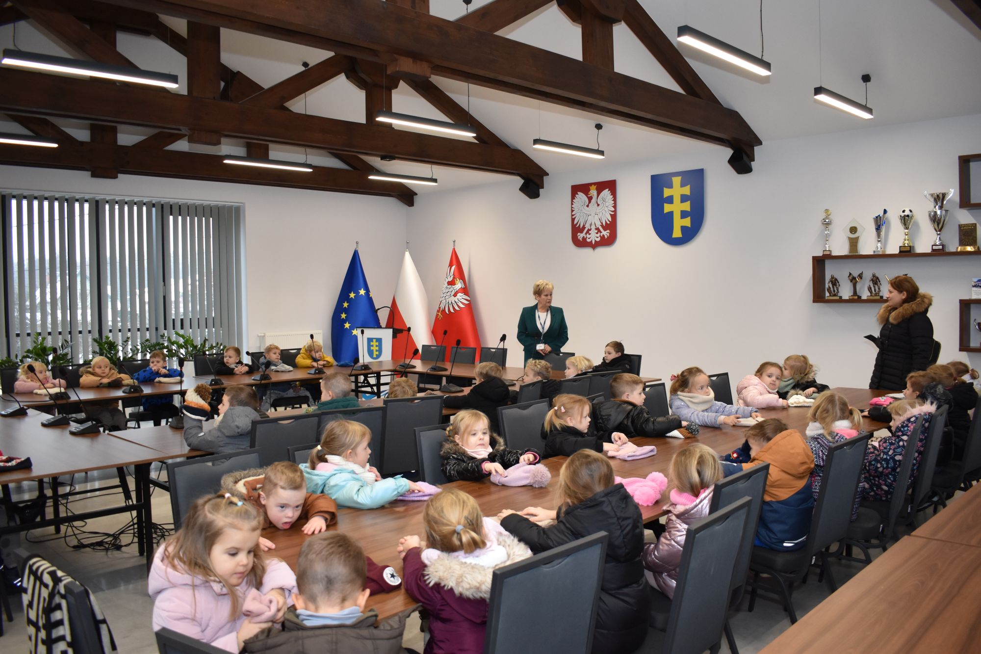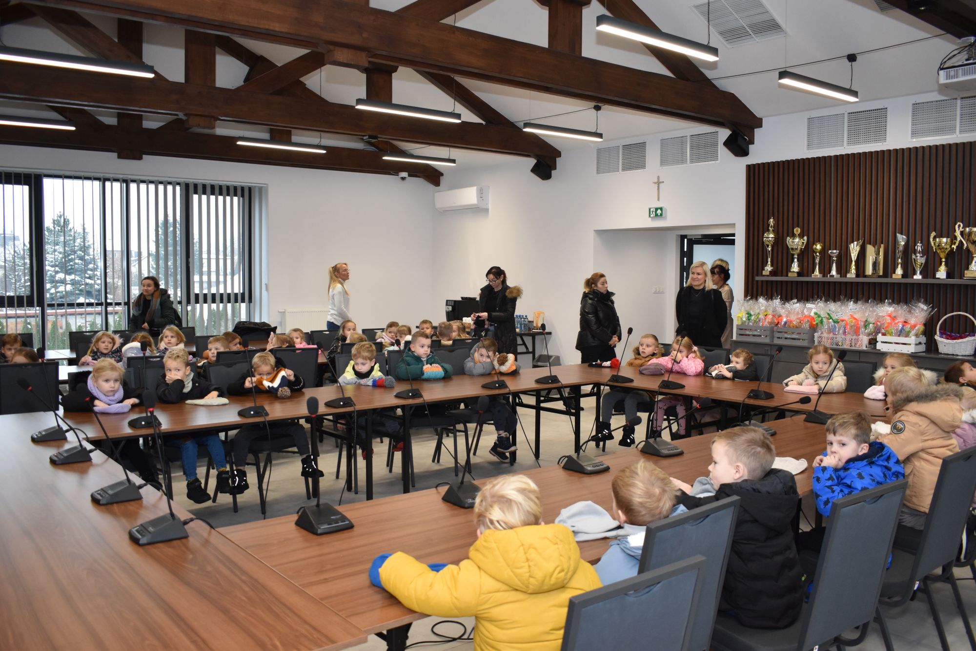 Zwiedzanie nowego budynku Urzędu dzieci rozpoczęły od Biura Obsługi Mieszkańców oraz gabinetu Burmistrza. Na dłuższą chwilę dzieci zatrzymały się na sali konferencyjnej, gdzie miały możliwość zadawania pytań. Tutaj również czekał na nie mały poczęstunek oraz miła niespodzianka. Dzieci obdarowane zostały drobnymi pamiątkami i słodkimi upominkami, co wywołało wiele uśmiechów i radości. Na ręce Burmistrza złożone zostało również podziękowanie oraz praca wykonana przez dzieci. Na koniec wizyty zrobiono wspólne pamiątkowe zdjęcia.
