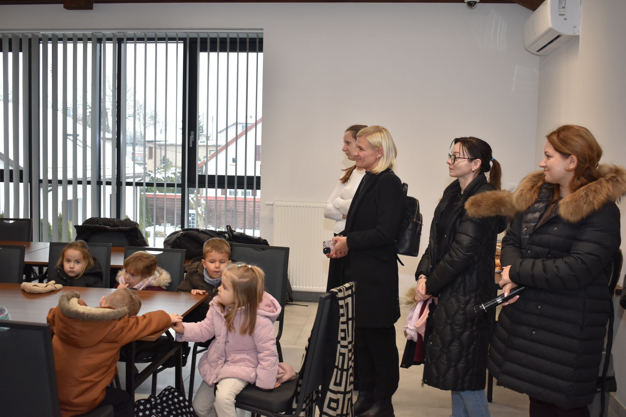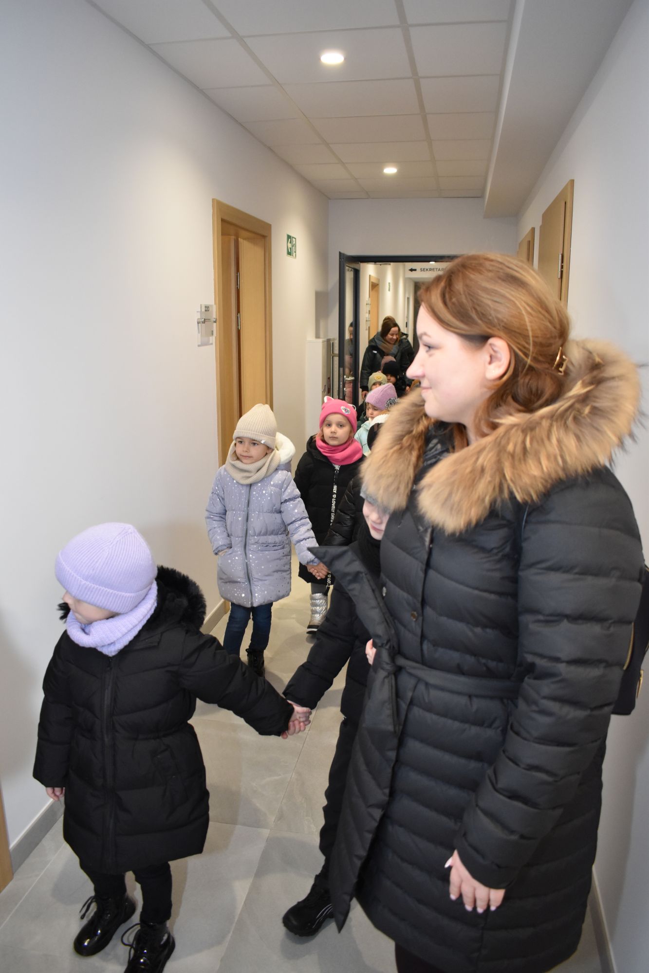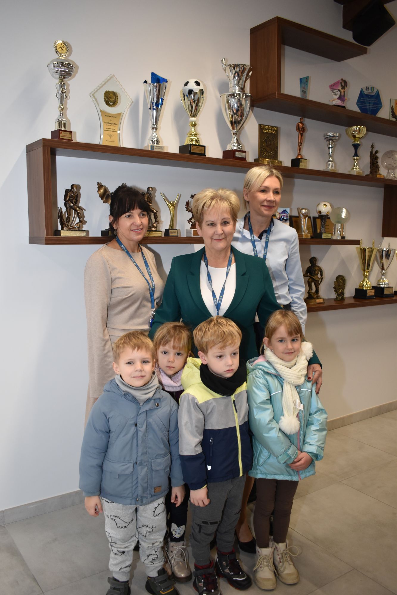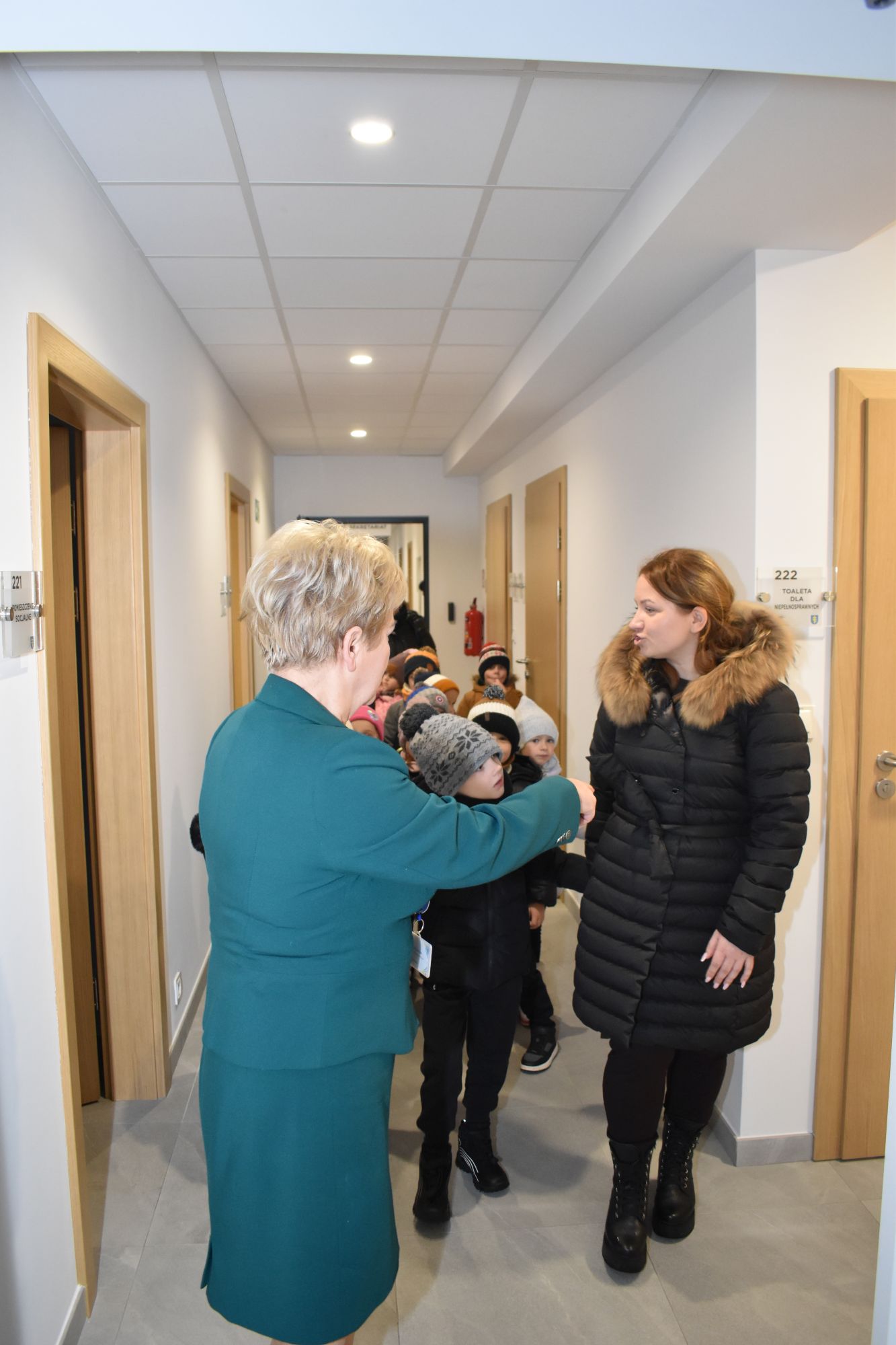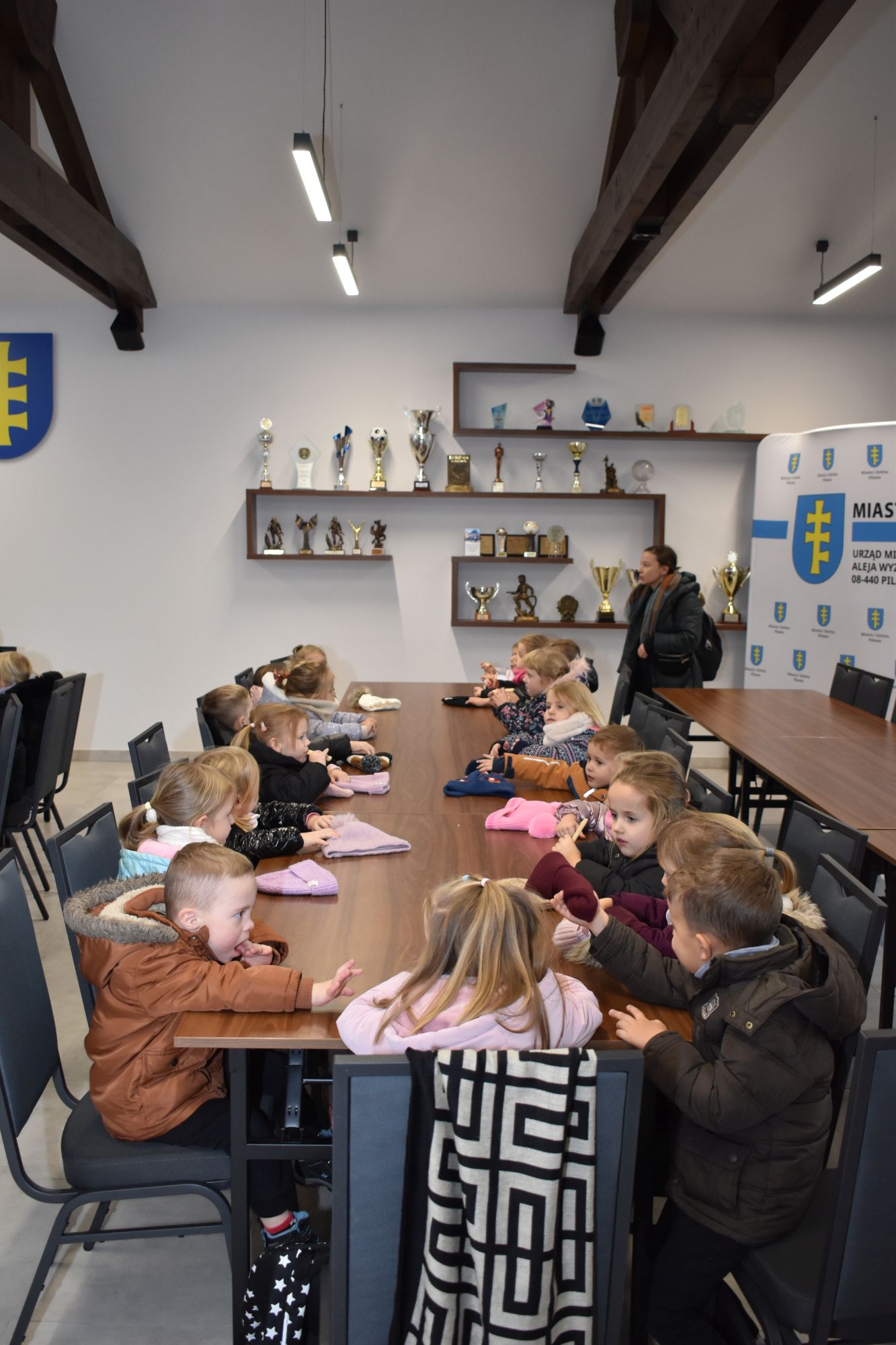 Zwiedzanie nowego budynku Urzędu dzieci rozpoczęły od Biura Obsługi Mieszkańców oraz gabinetu Burmistrza. Na dłuższą chwilę dzieci zatrzymały się na sali konferencyjnej, gdzie miały możliwość zadawania pytań. Tutaj również czekał na nie mały poczęstunek oraz miła niespodzianka. Dzieci obdarowane zostały drobnymi pamiątkami i słodkimi upominkami, co wywołało wiele uśmiechów i radości. Na ręce Burmistrza złożone zostało również podziękowanie oraz praca wykonana przez dzieci. Na koniec wizyty zrobiono wspólne pamiątkowe zdjęcia.