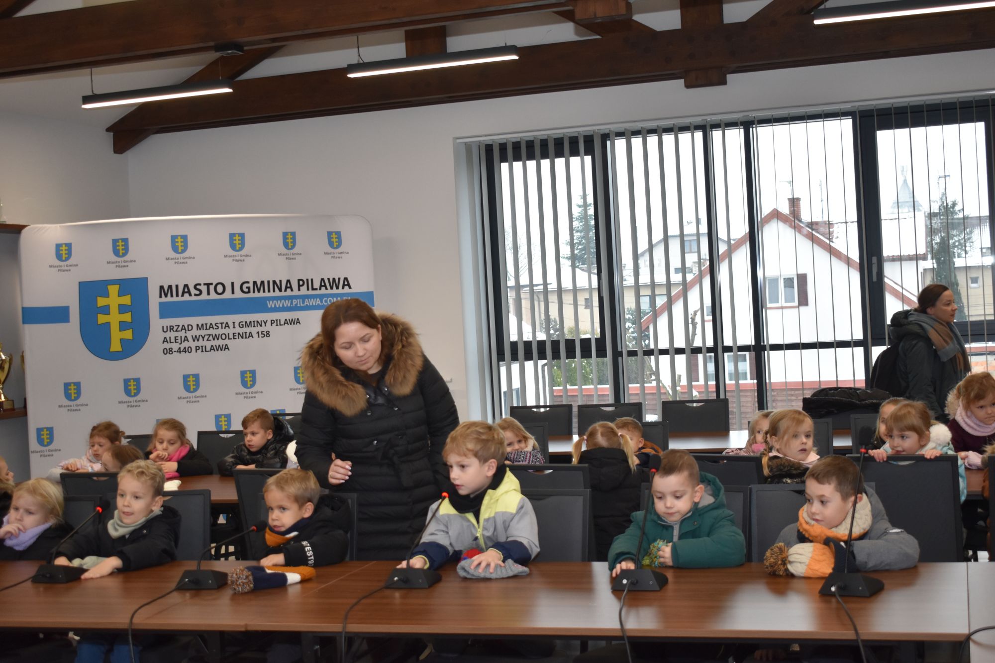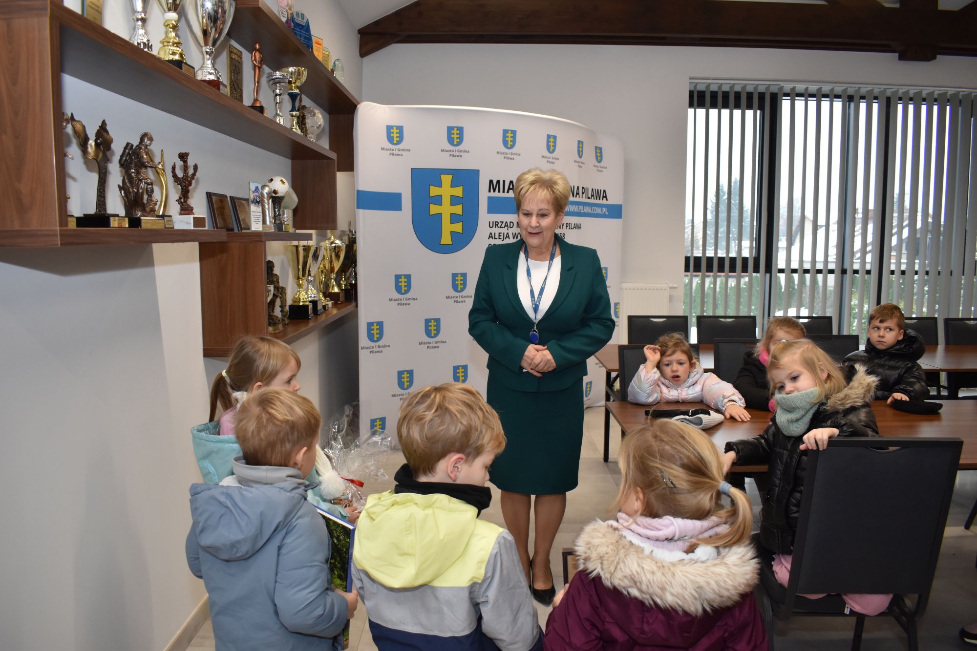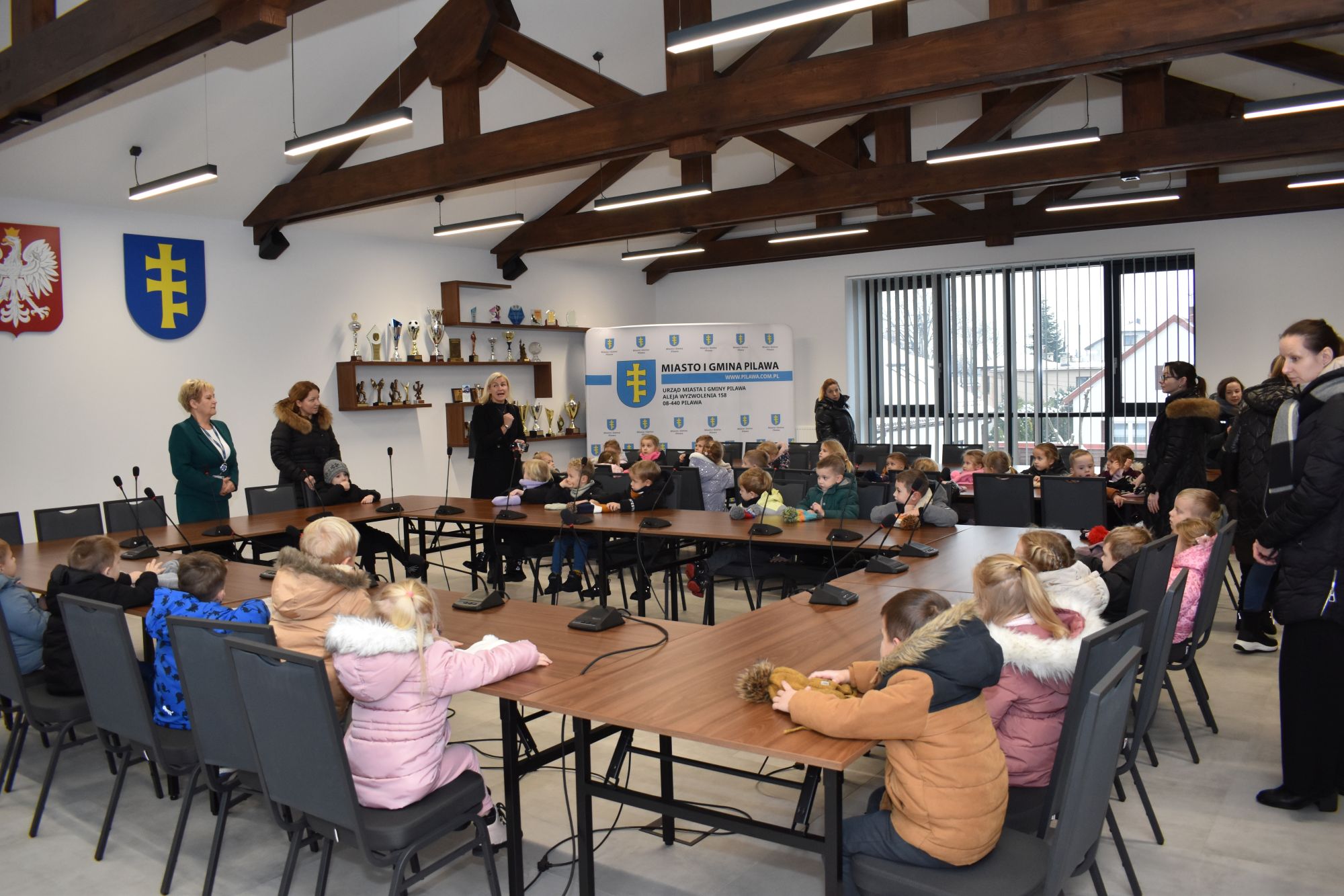 We wtorek 25 listopada 2025 roku, w Urzędzie Miasta i Gminy w Pilawie miała miejsce wyjątkowa wizyta. Do siedziby Urzędu przybyły przedszkolaki z gminy Górzno. Burmistrz Miasta i Gminy Pilawa Albina Łubian wraz z Zastępcą Agnieszką Dębowską oraz Sekretarzem Moniką Śniegucką z ogromną przyjemnością przyjęli niecodziennych gości, a spotkanie upłynęło w miłej i radosnej atmosferze. Wizyta przedszkolaków wprowadziła wiele uśmiechu i pozytywnej energii. Burmistrz z entuzjazmem opowiadała o roli i pracy samorządu.