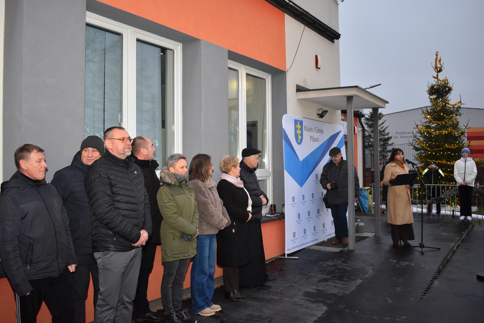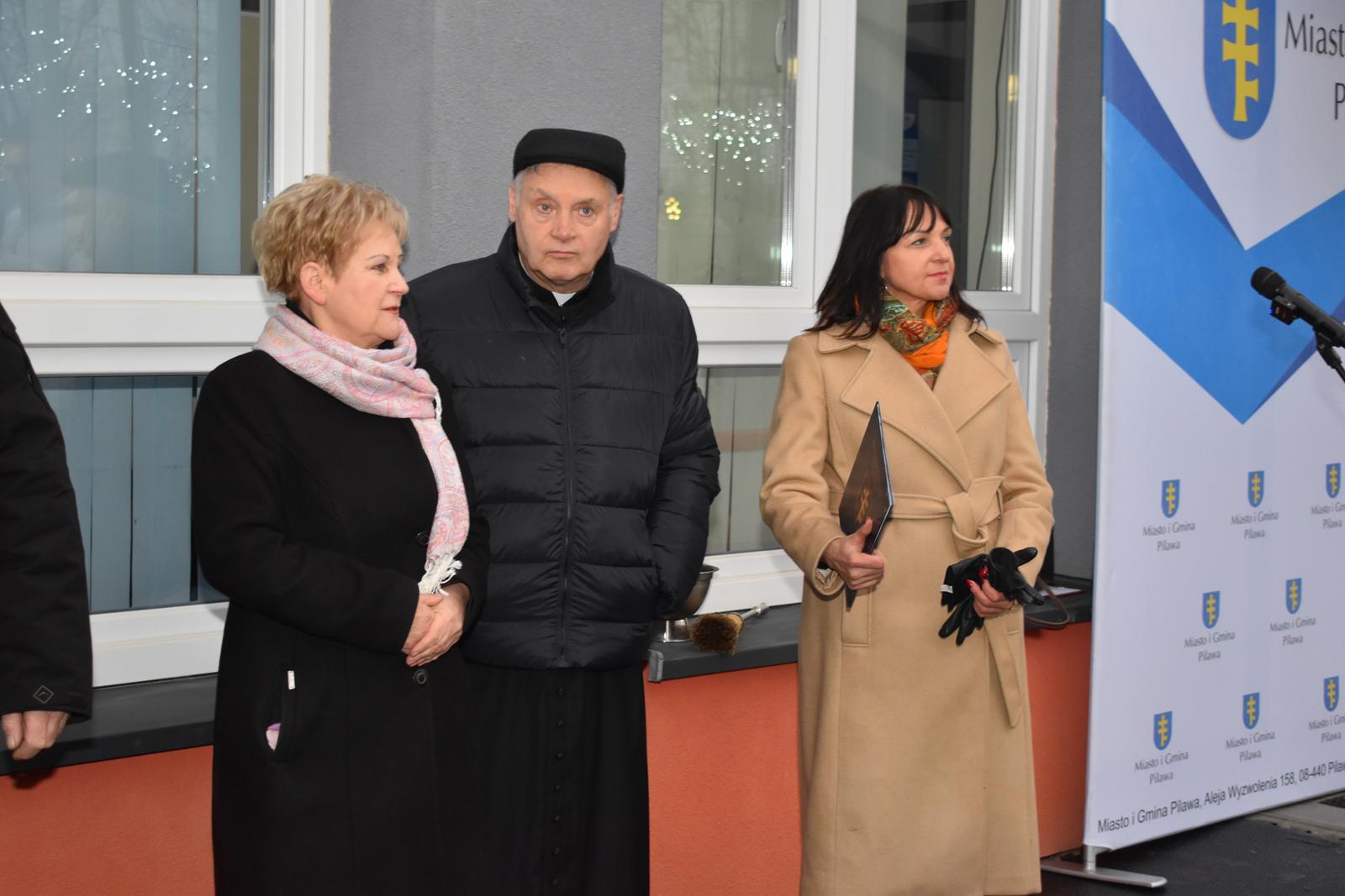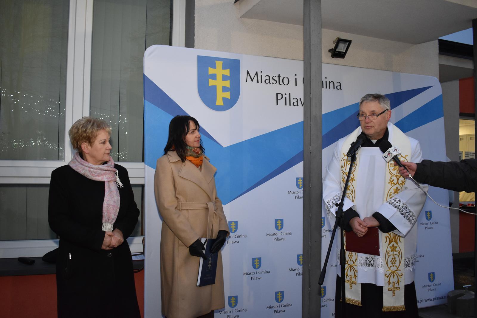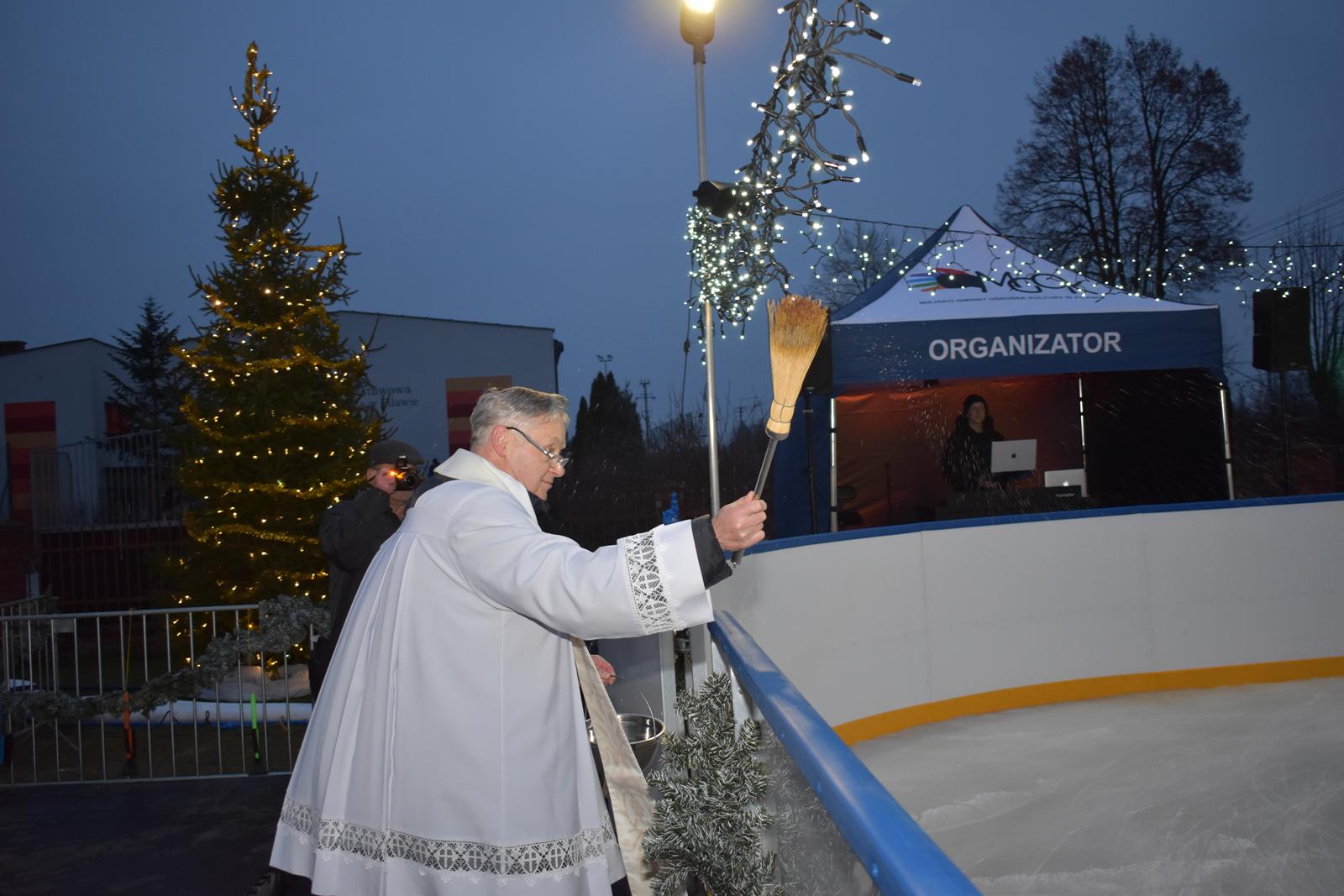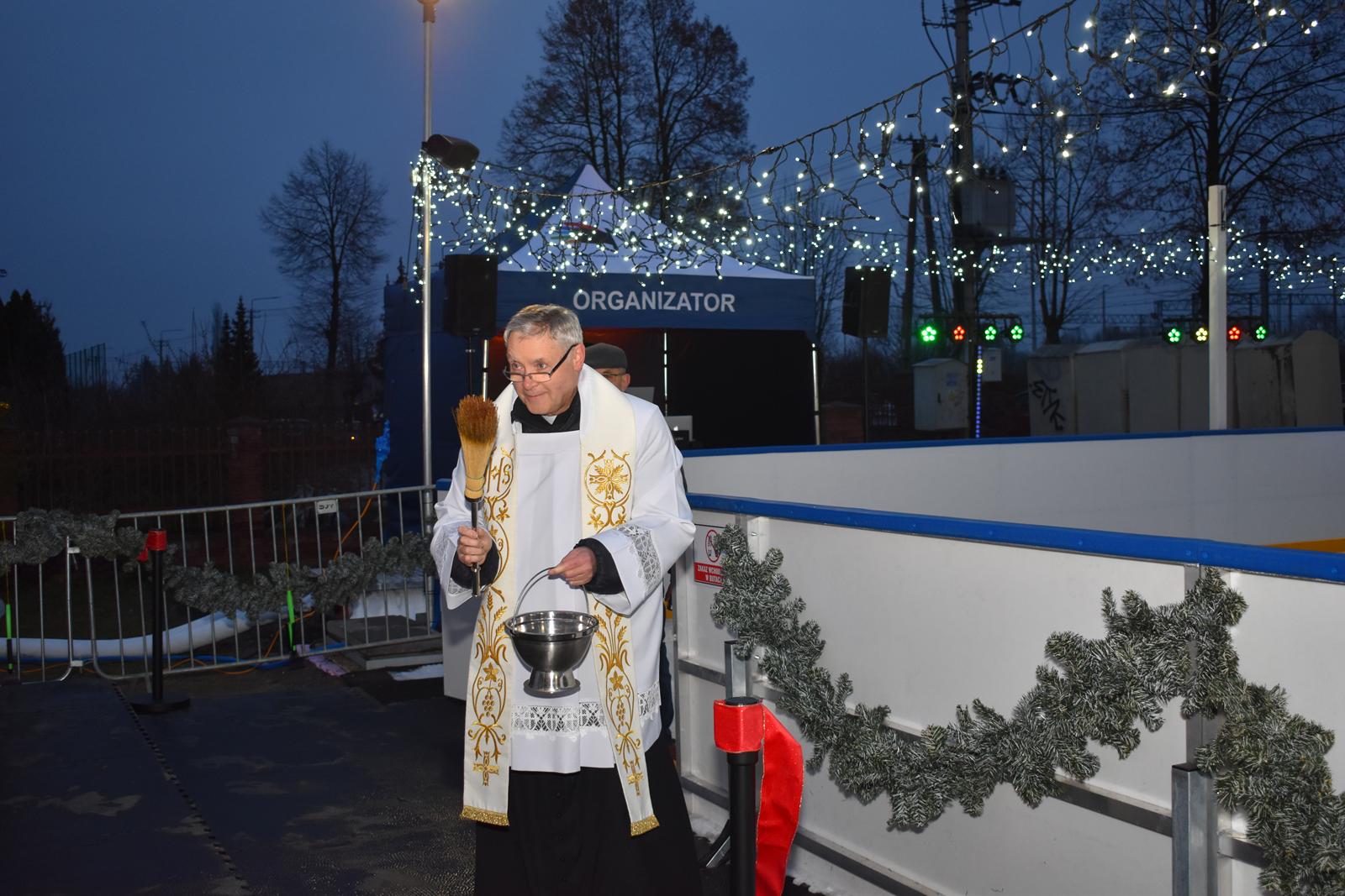 W dalszej części odbyło się symboliczne przecięcie wstęgi oficjalnie otwierające wejście na lodowisko, a następnie obiekt został uroczyście poświęcony przez ks. kanonika Andrzeja Banasiuka proboszcza parafii w Pilawie.