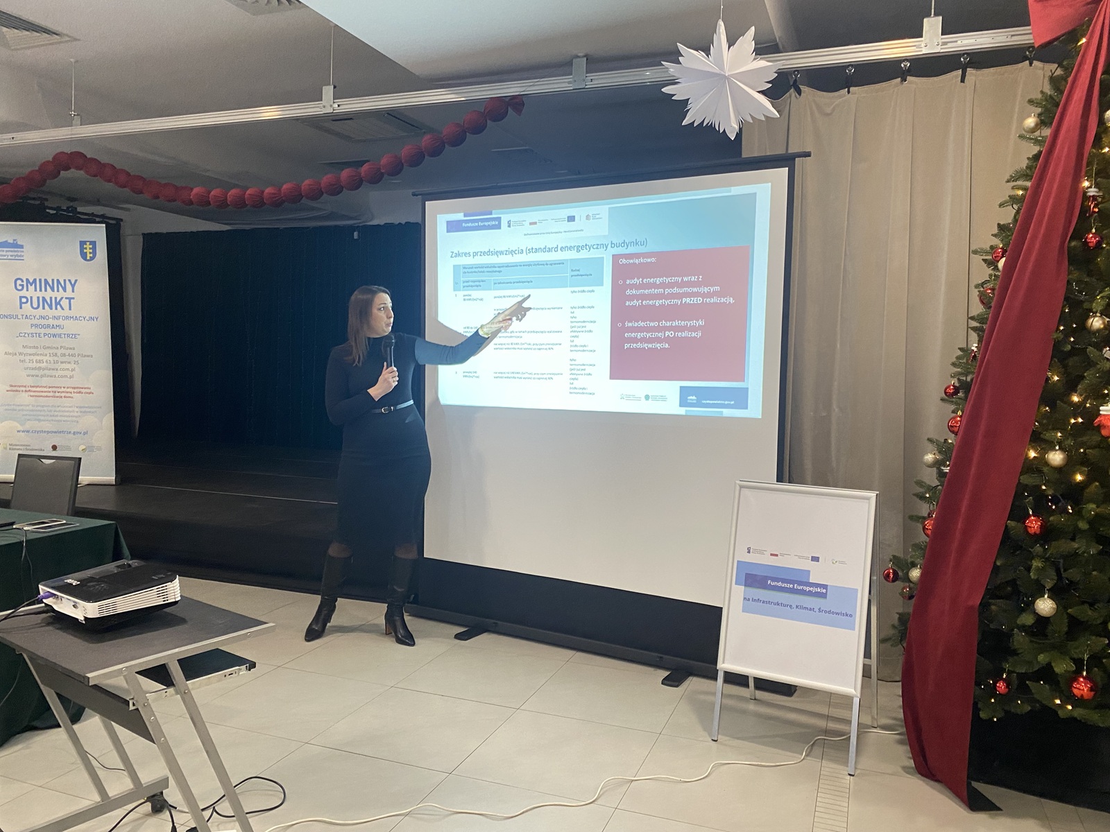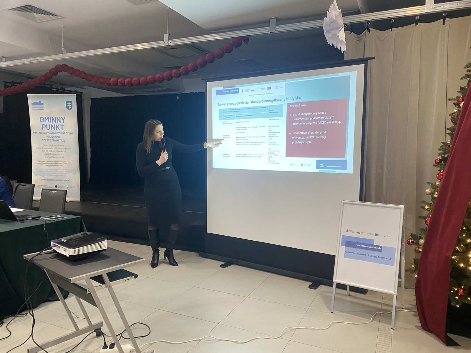 W bardzo przystępny sposób wyjaśniła, kto jest uprawniony do korzystania z Programu Czyste Powietrze, jakie są poziomy dofinansowania, oraz jakie dokumenty są niezbędne do złożenia wniosku. Szczegółowo omówiła kryteria uczestnictwa w programie oraz maksymalną wysokość możliwego dofinansowania. Zwróciła uwagę na wymóg przeprowadzenia audytu energetycznego przed rozpoczęciem przedsięwzięcia oraz uzyskania świadectwa efektywności energetycznej po zakończeniu inwestycji. W praktyce oznacza to, że audyt jest pierwszym i niezbędnym krokiem do udziału w Programie Czyste Powietrze.