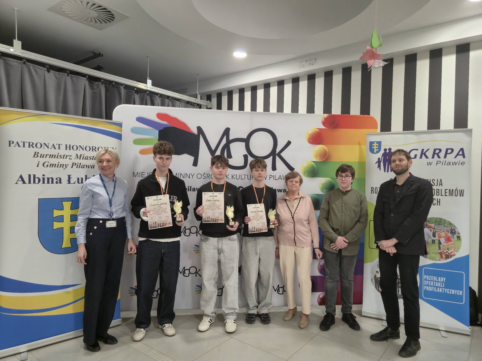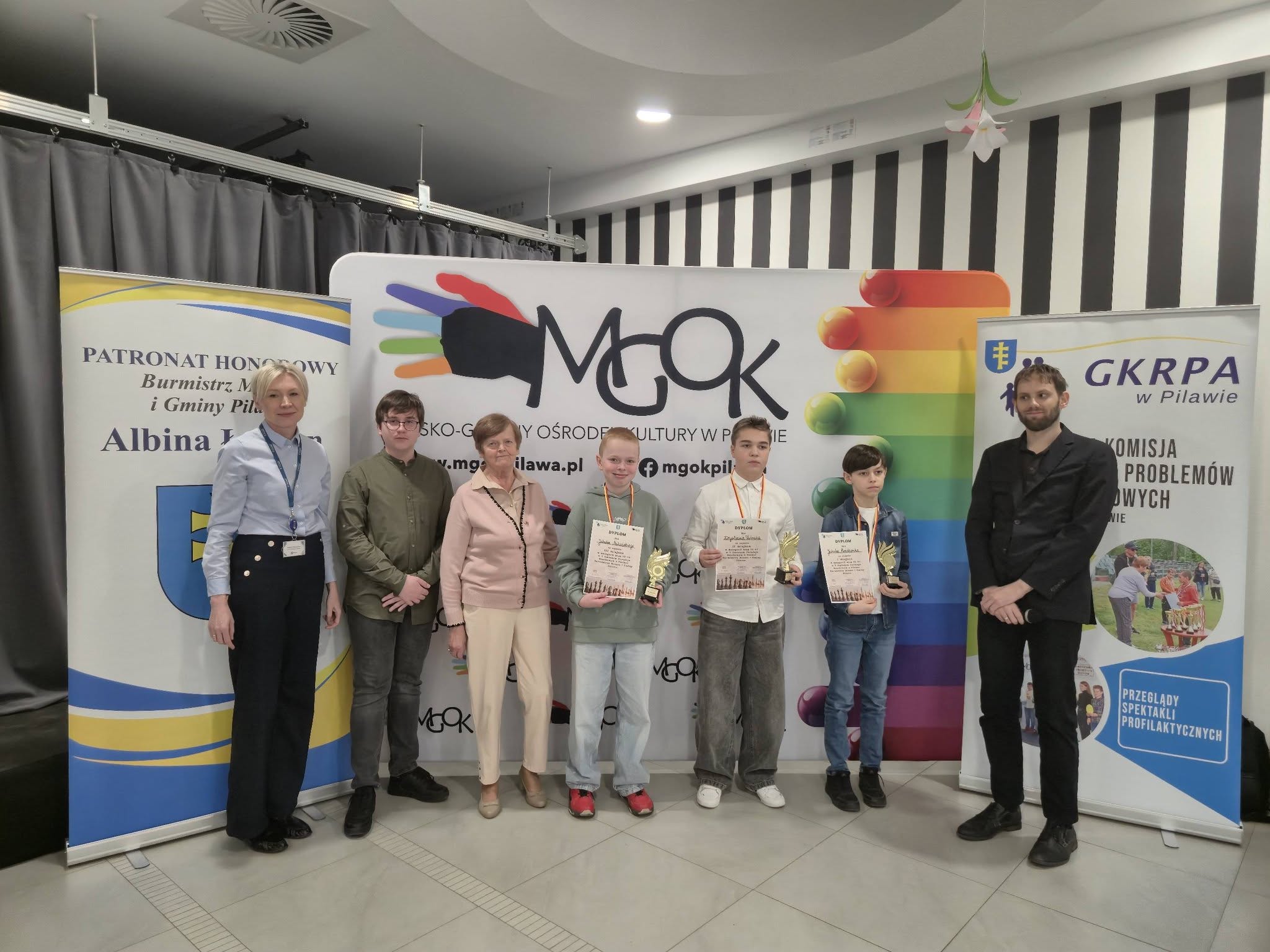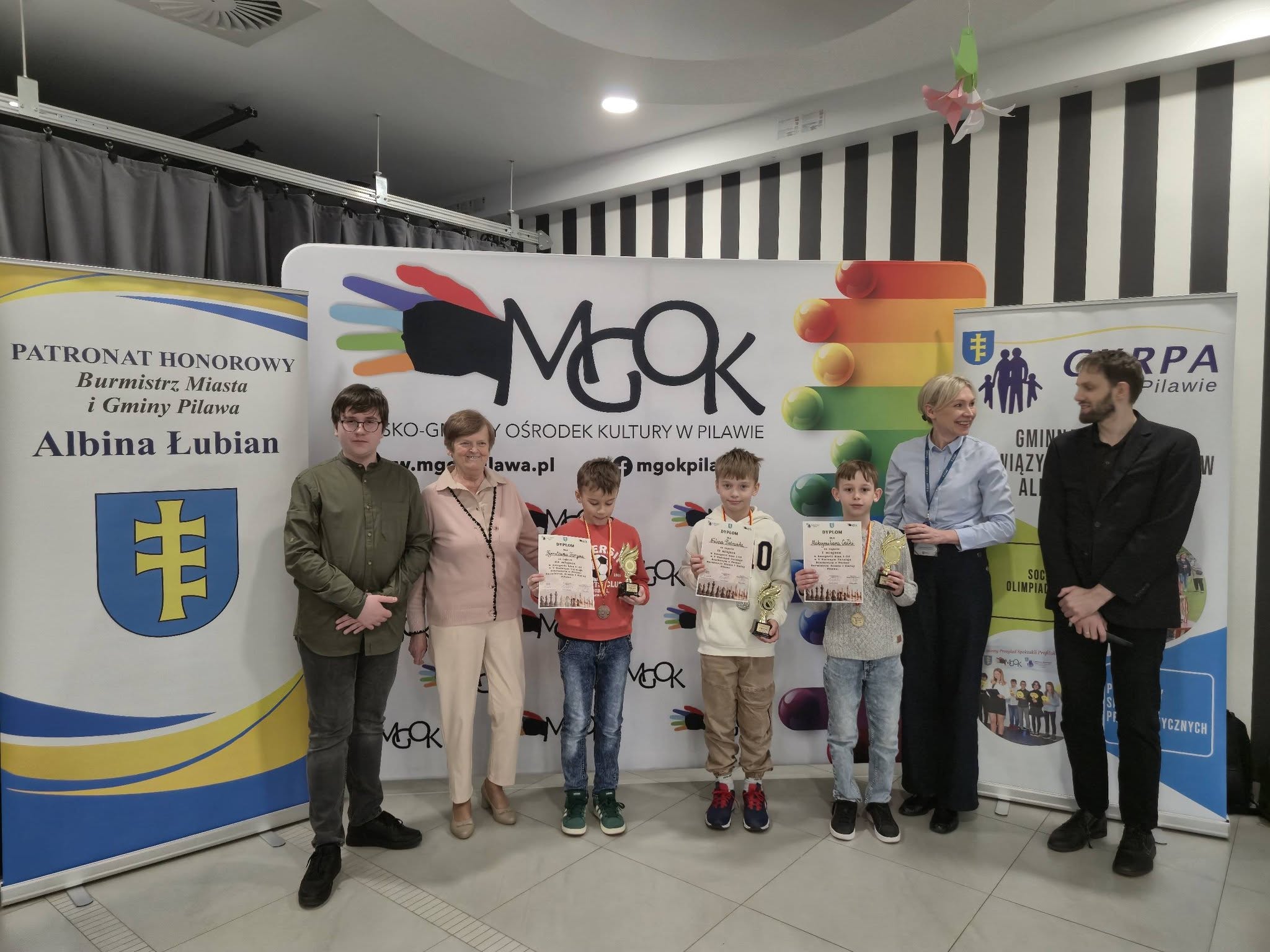 Puchary i dyplomy w imieniu Burmistrza Miasta i Gminy Pilawa Albiny Łubian wręczyła Sekretarz Monika Śniegucka, która w krótkim podsumowaniu wydarzenia podkreśliła wysoki poziom rozgrywek oraz umiejętności młodych szachistów.
