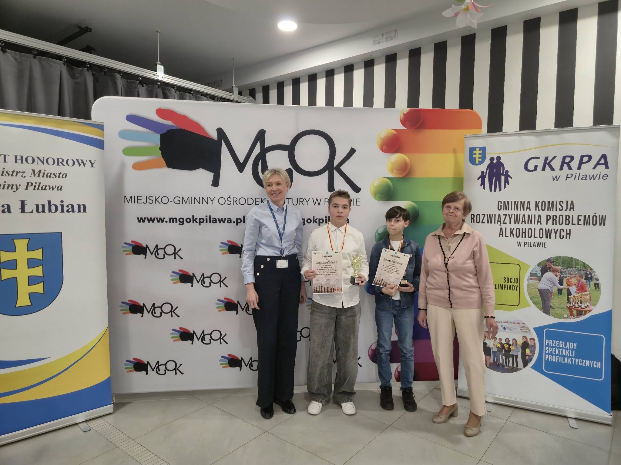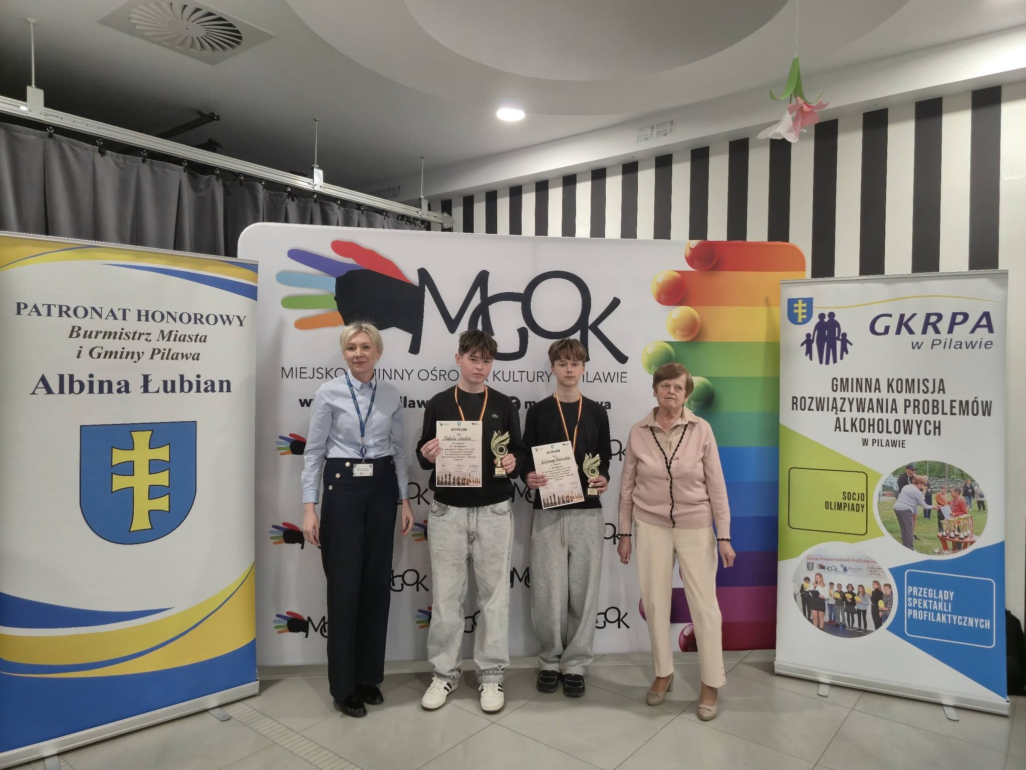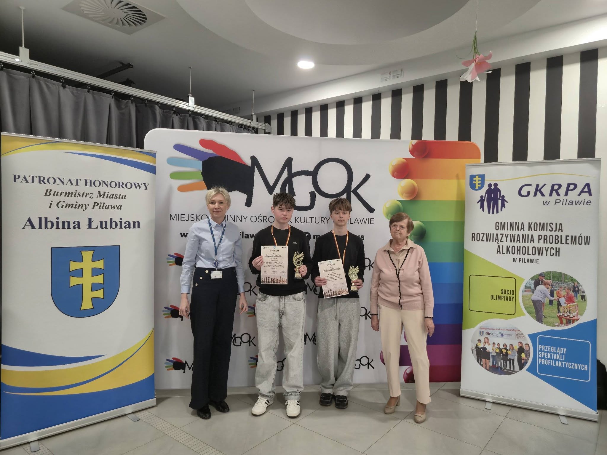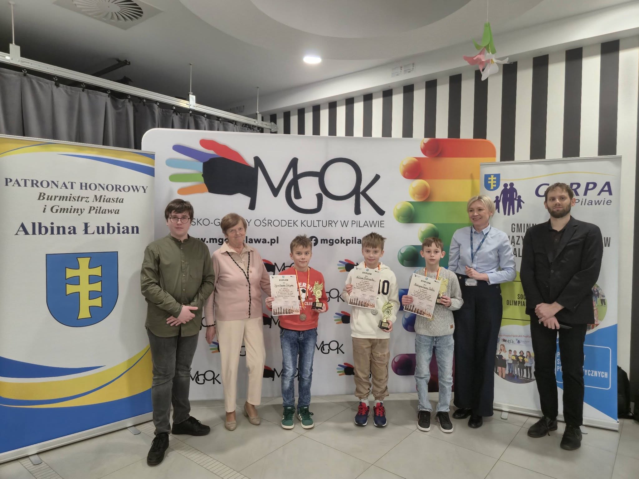 Puchary i dyplomy w imieniu Burmistrza Miasta i Gminy Pilawa Albiny Łubian wręczyła Sekretarz Monika Śniegucka, która w krótkim podsumowaniu wydarzenia podkreśliła wysoki poziom rozgrywek oraz umiejętności młodych szachistów.