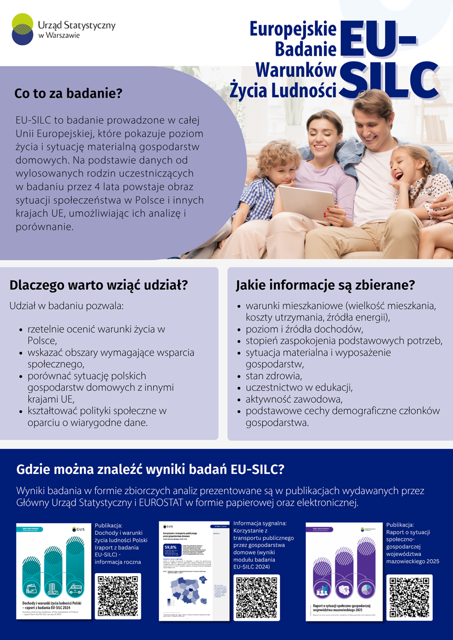 Urząd Statystyczny w Warszawie realizuje kolejną edycję Europejskiego Badania Warunków Życia Ludności (EU-SILC). Wyniki tego badania są bardzo ważne dla zrozumienia sytuacji materialnej rodzin w Polsce oraz pozwalają na porównanie poziomu życia w naszym regionie z innymi krajami Unii Europejskiej.