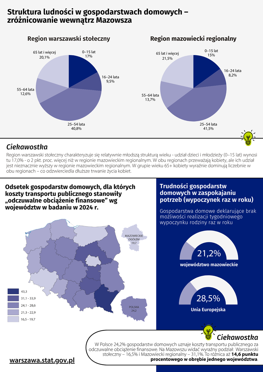 - W województwie mazowieckim 21,2% gospodarstw domowych deklaruje brak możliwości wyjazdu na tygodniowy wypoczynek raz w roku (dla porównania w całej UE to średnio 28,5%).