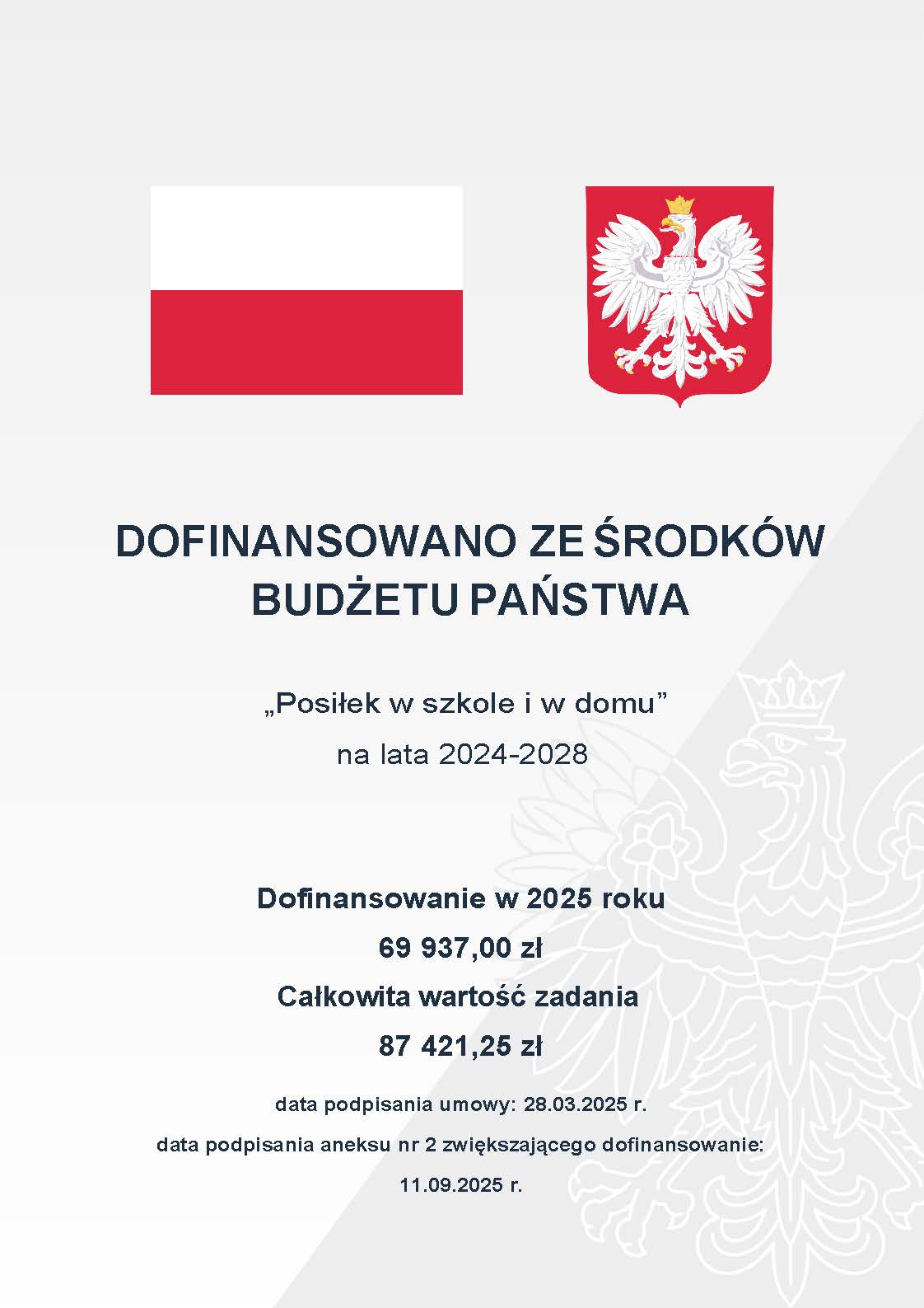 W dniu 28 marca 2025 r. Miasto i Gmina Pilawa podpisała Umowę nr WRPS-VI.946.1.25.2025 o wsparcie realizacji zadania własnego o charakterze obowiązkowym, realizowanego w ramach wieloletniego rządowego programu „Posiłek w szkole i w domu” na lata 2024-2028.